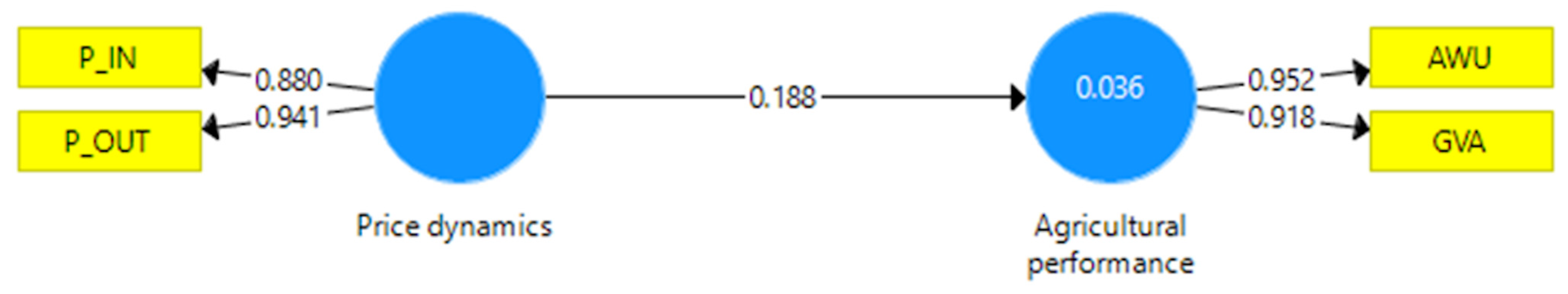 The reliability indicators show that the observed variables effectively reflect the underlying constructs, confirming their validity. Discriminant validity, assessed through the Fornell–Larcker criterion, clearly distinguishes the constructs: the values of 0.881 for agricultural performance and 0.839 for price dynamics surpass the squared correlation between them, ensuring a conceptual separation. The VIF values are all below 3, indicating minimal multicollinearity and suggesting that the variables operate relatively independently without excessive overlap among their predictive structures (see