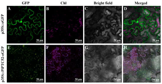 Subcellular localization of PlPTC52 in N. benthamiana leaf epidermal cells. (A,E) Fluorescence signal from the 35S::eGFP and 35S::PlPTC52-eGFP constructs at 488 nm; (B,F) Chloroplast autofluorescence signal at 663 nm; (C,G) bright field images; (D) merged image of panels (A–C); (H) merged image of panels (E–G). Green fluorescence indicates GFP signals, while magenta fluorescence represents chloroplast autofluorescence. GFP; green fluorescence; Chl: chloroplast autofluorescence.