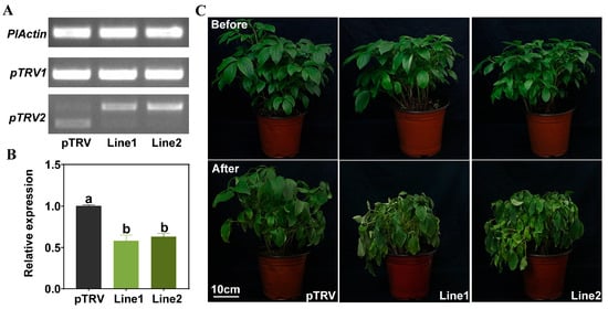 Positive plant identification and phenotypic observation of PlPTC52-silenced plants. (A) PCR validation of PlPTC52-silenced plants; (B) qPCR validation of PlPTC52-silenced plants. Different letters indicate significant differences (p < 0.05); (C) Phenotypic observation of PlPTC52-silenced plants after high temperature stress.