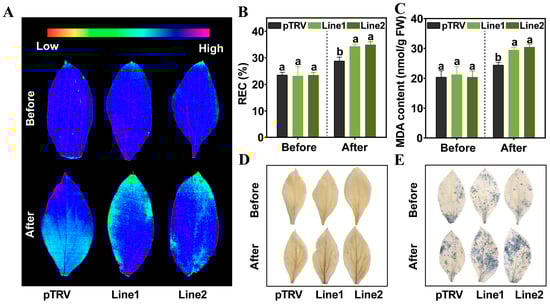 Physiological indices of PlPTC52-overexpressing plants. (A) Fv/Fm value of WT and PlPTC52-overexpressing plants; (B) REC level of WT and PlPTC52-overexpressing plants; (C) MDA content of WT and PlPTC52-overexpressing plants; (D) DAB staining of WT and PlPTC52-overexpressing plants; (E) NBT staining of WT and PlPTC52-overexpressing plants. Different letters indicate significant differences (p < 0.05).