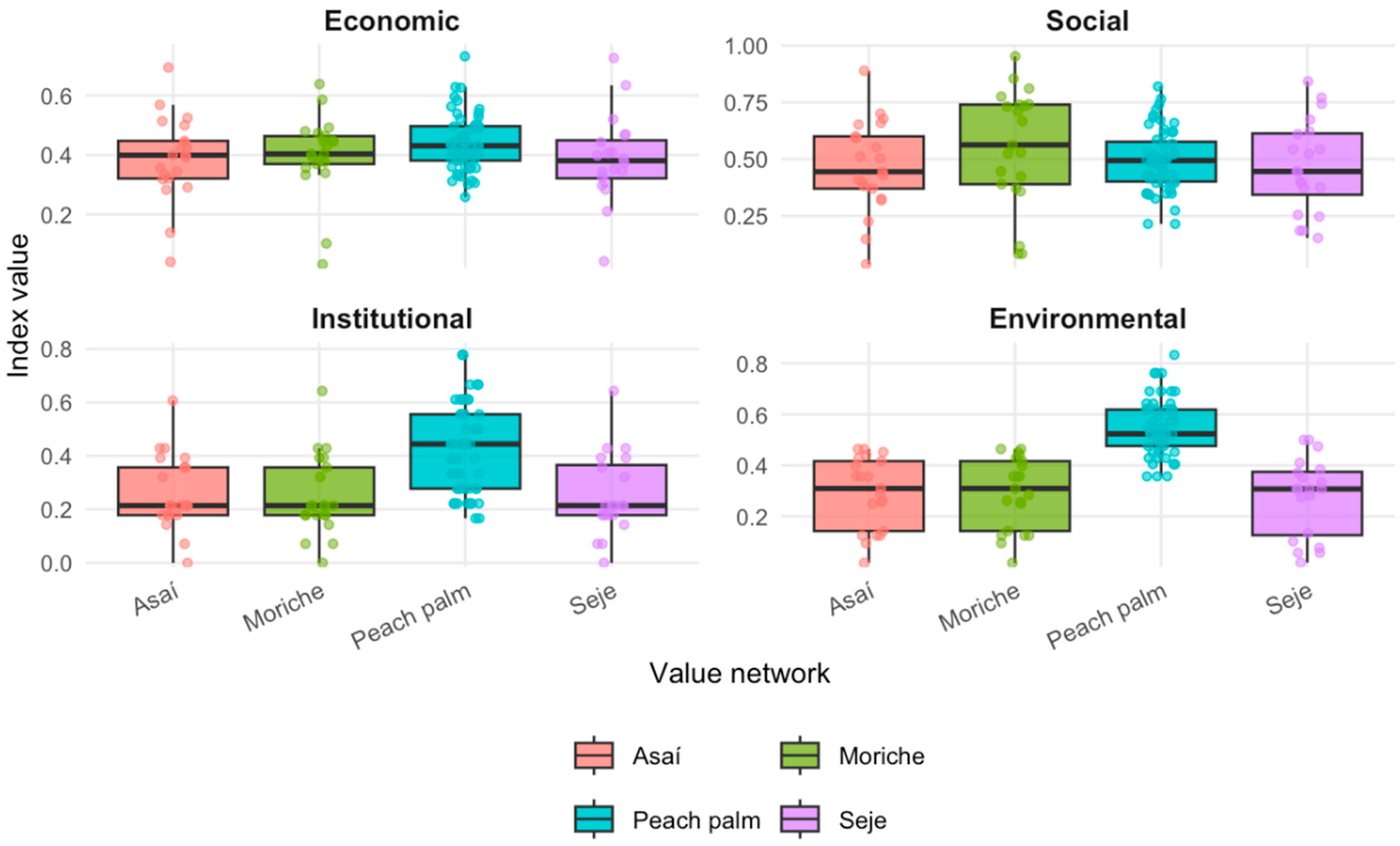 In the institutional dimension, Peach palm achieves the highest values in institutional training (0.53), road infrastructure (0.56), and collaborative agreements (0.55), suggesting a relatively more favorable institutional environment. Asaí, Seje, and Moriche show low and comparable results (0.41–0.04). Low levels of financial support are consistent across all networks (0.28–0.04), with Seje and Moriche presenting the lowest values.