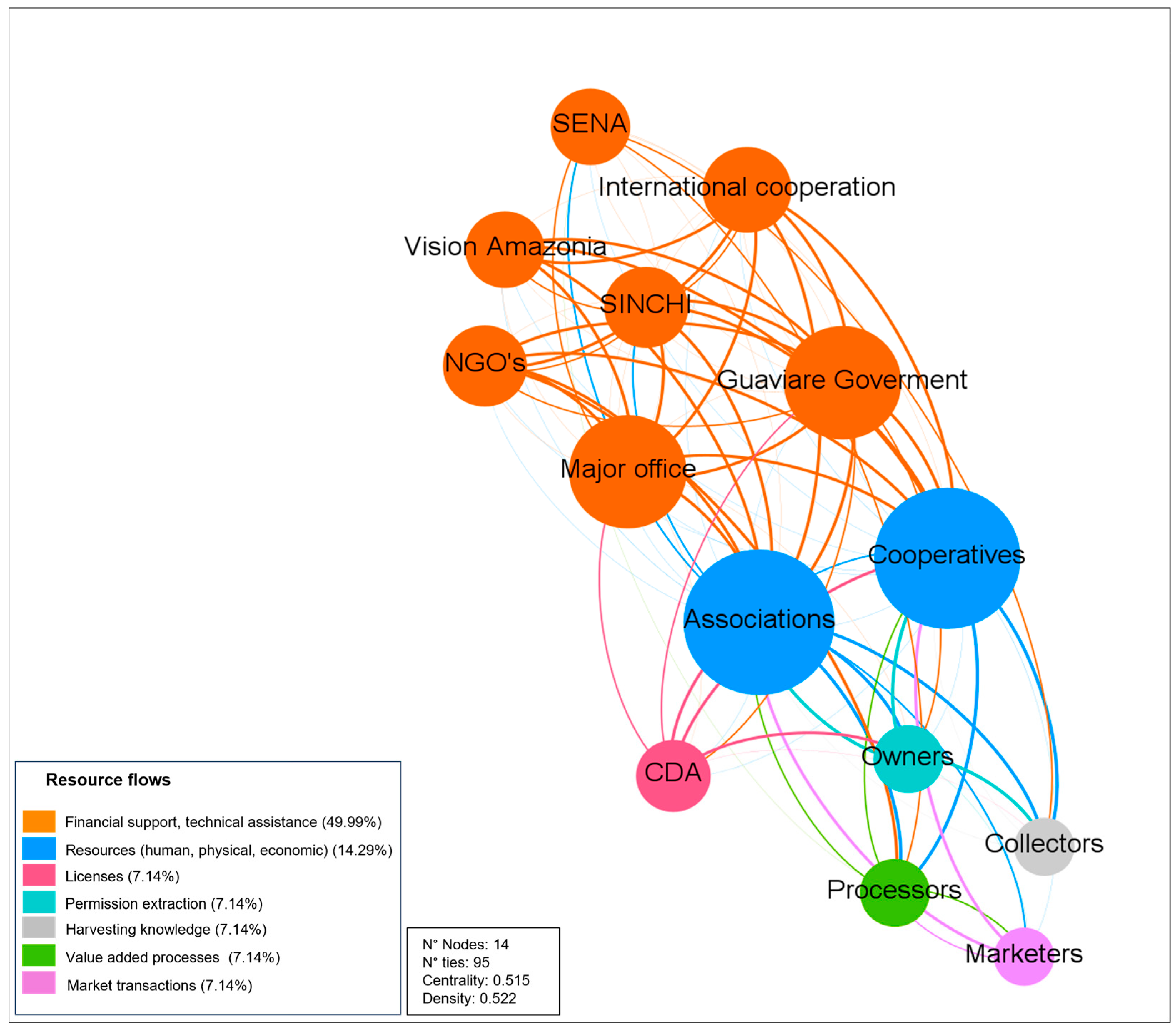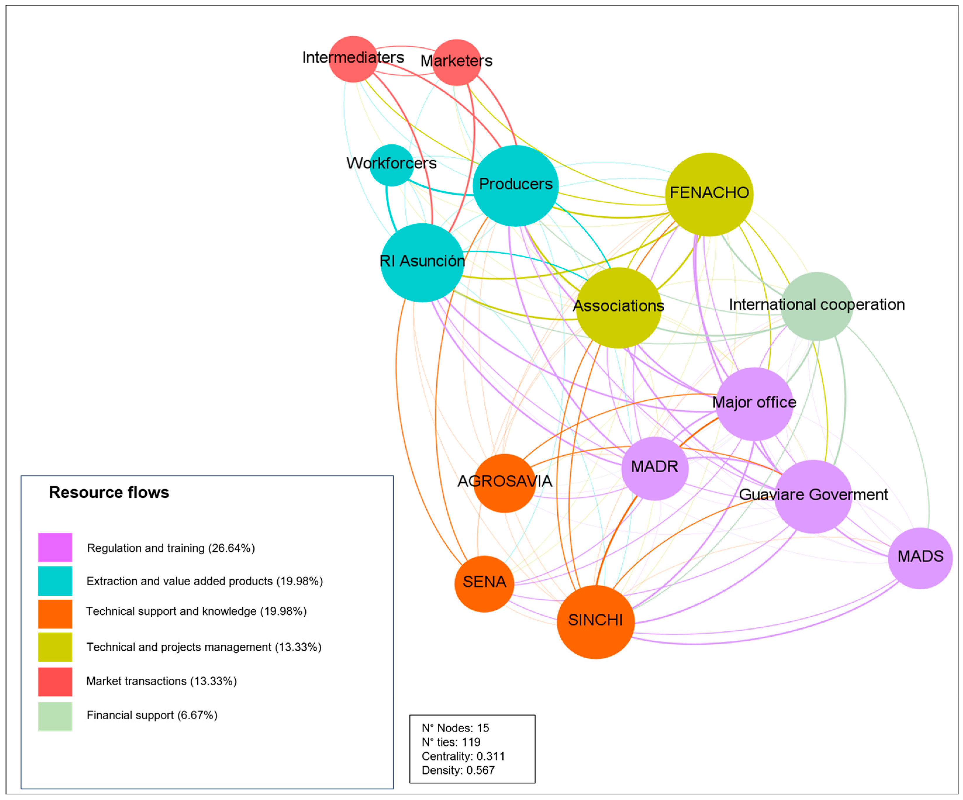 Functionally, associations and cooperatives act as intermediaries bridging structural gaps between the state/cooperation sphere and the operational stages of the chain. Through them, they circulate resources such as technical assistance, training, product transformation, and marketing strategies. The centrality of SINCHI and the departmental government suggests strong anchoring in development, research, technology, and public coordination. However, these ties do not extend directly to marketers or processors, evidencing that market nodes maintain few direct connections with the state–technical block, a symptom of weak commercialization formalization. The lateral position of CDA reinforces the interpretation of proceduralist environmental regulation—focused on licenses and management plans—as a regulatory actor, but with very low capacity to relate to the total node of the network, which effectively makes it a non-central actor, although this result is surprising in a value network that depends on the license to make use of the resource. This limits its operational impact on technical assistance and the sustainability of forest management, primarily due to a lack of institutional coordination.