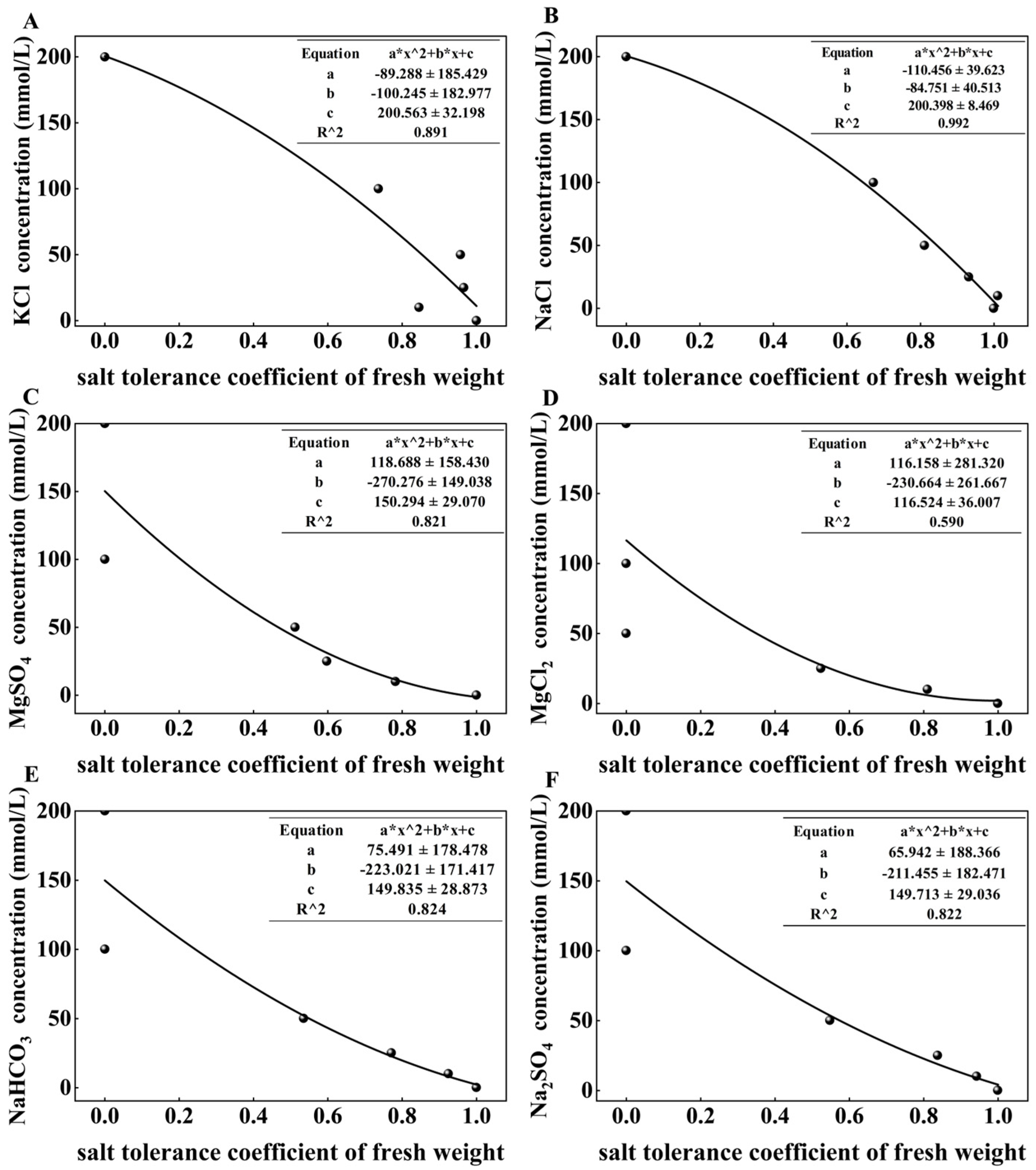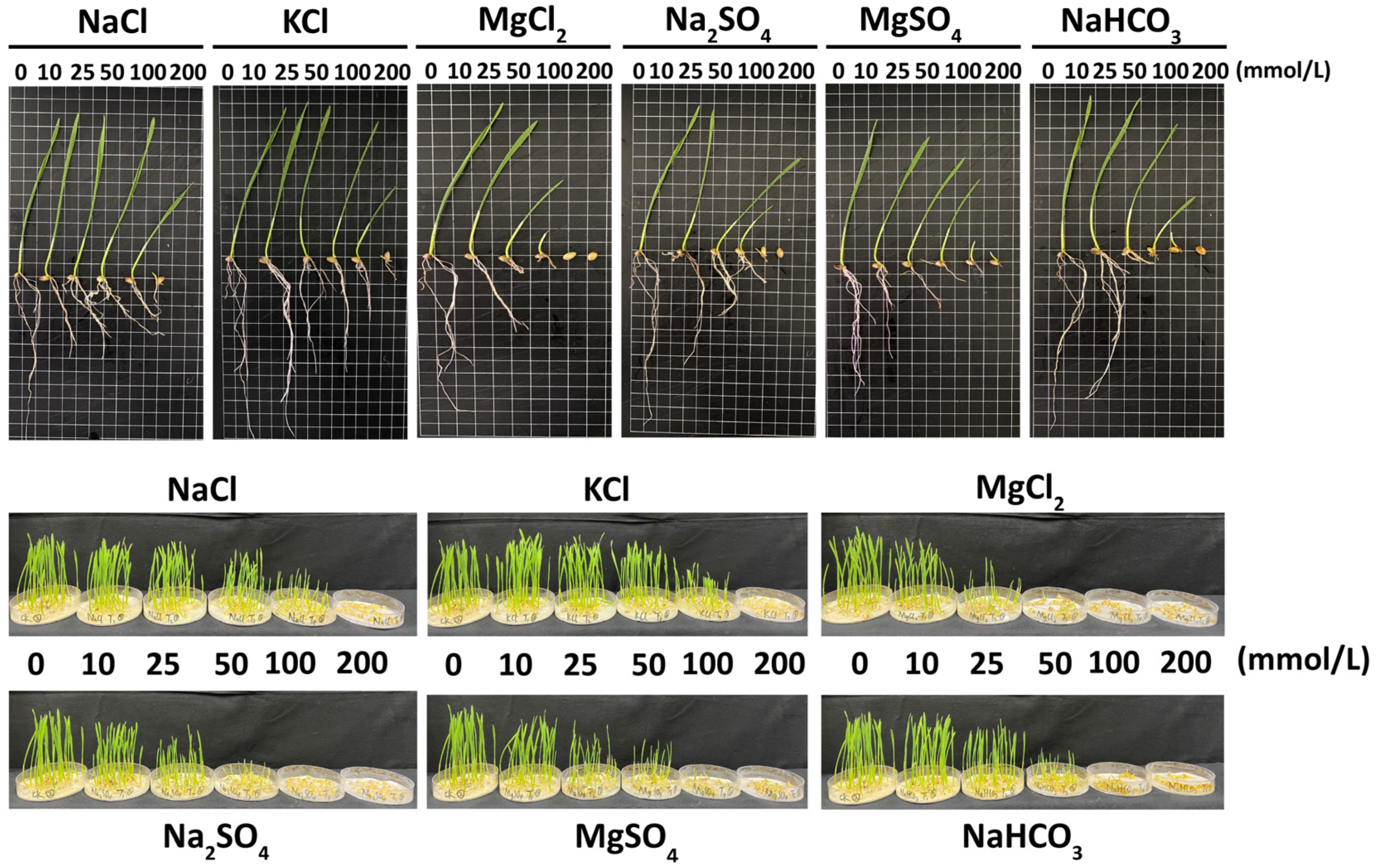 3.5. LC50s of Different Salt Stresses on Wheat During the Germination Stage