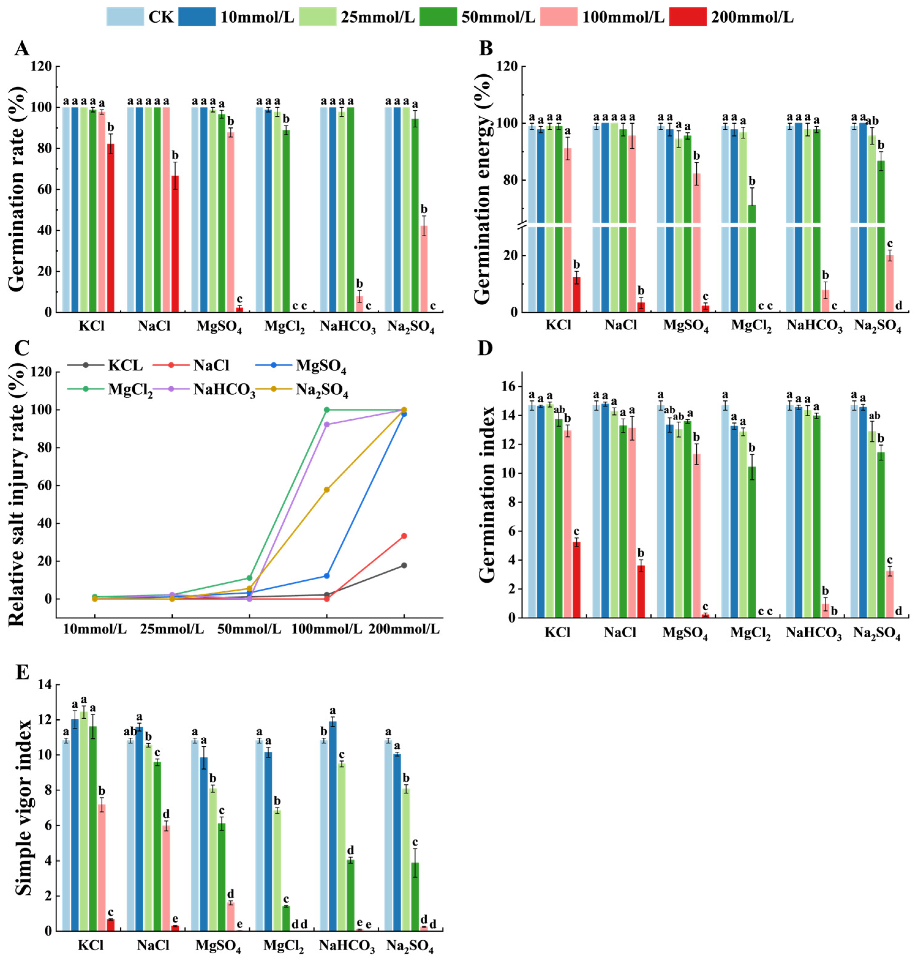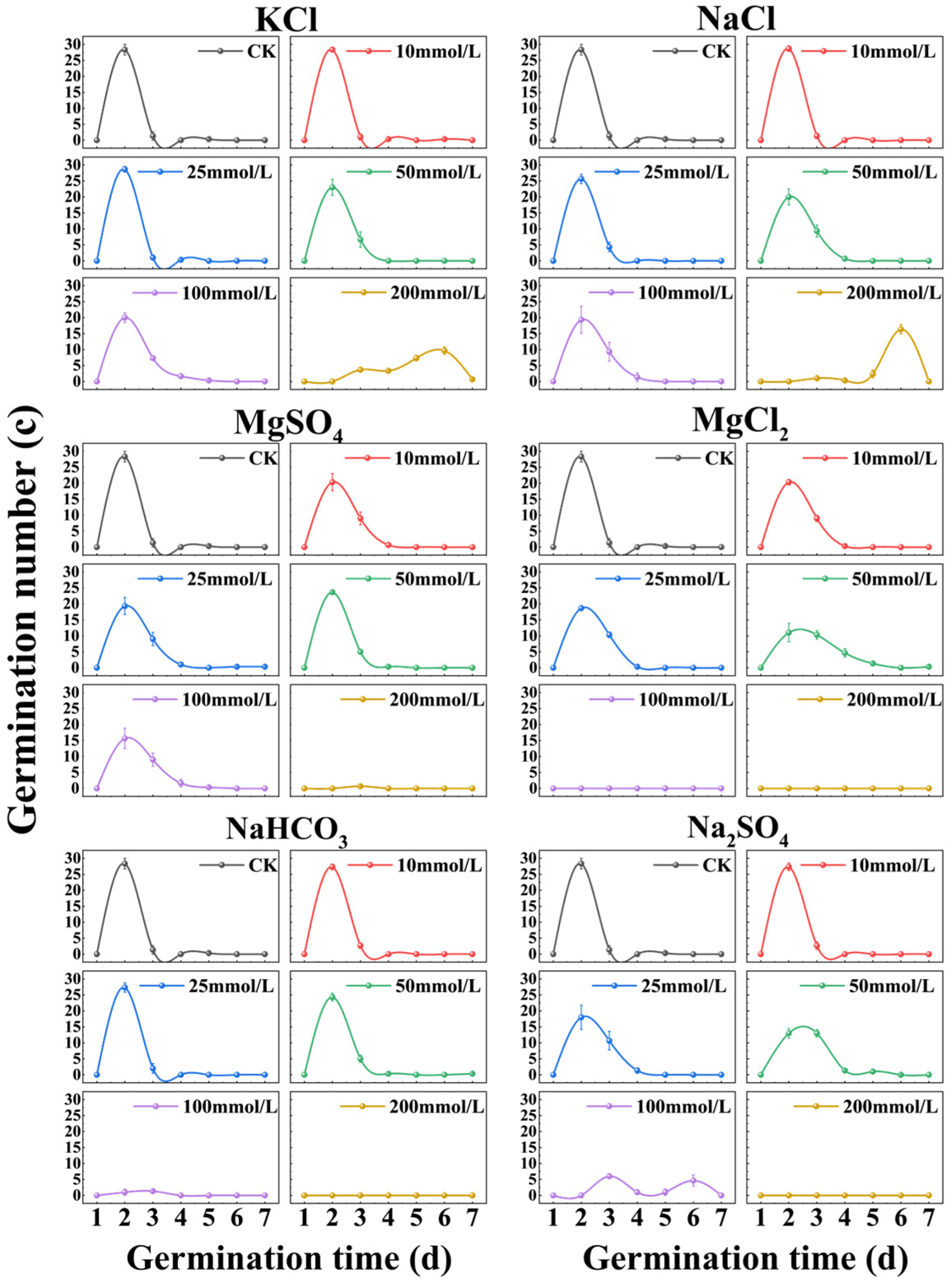 3.2. Effects of Different Types of Salt Stress on Wheat Germination Indicators