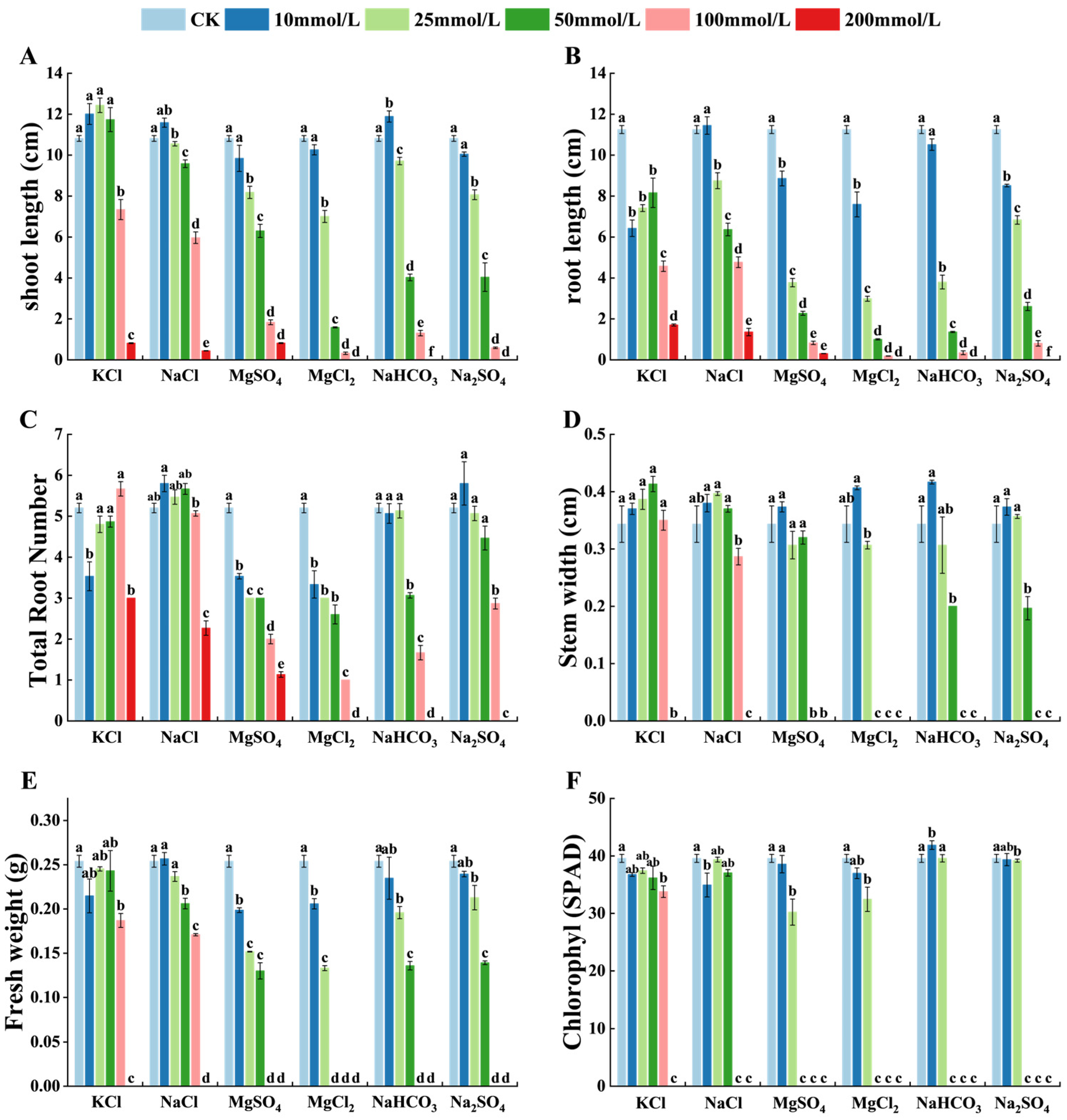 3.4. Effects of Different Types of Salt Stress on Wheat Growth Indicators
