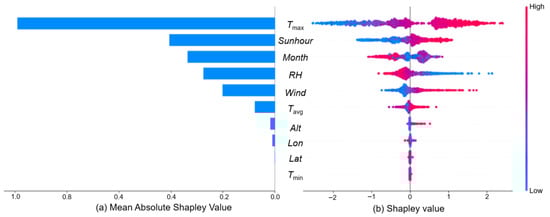 By computing mean absolute SHAP values across all 698 national meteorological stations, we established the global importance ranking of input features for ET0 estimation [38]. Figure 2a presents these values derived from the RF model, revealing the following influence hierarchy after weighted sorting: Tmax > Sunhour > Month > RH > Wind > Tavg > Alt > Lon > Lat > Tmin. Among these features, Tmax demonstrated the highest mean absolute SHAP value (approximately 0.98), establishing it as the most critical parameter—significantly outperforming other factors. This prominence reflects the dominant role of Tmax in the RF model, which is consistent with its well-established influence on saturation vapor pressure and vapor pressure deficit in physical evapotranspiration processes.