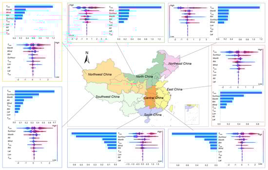 Regional patterns of feature importance and SHAP-based variable effects across seven climatic zones in China.