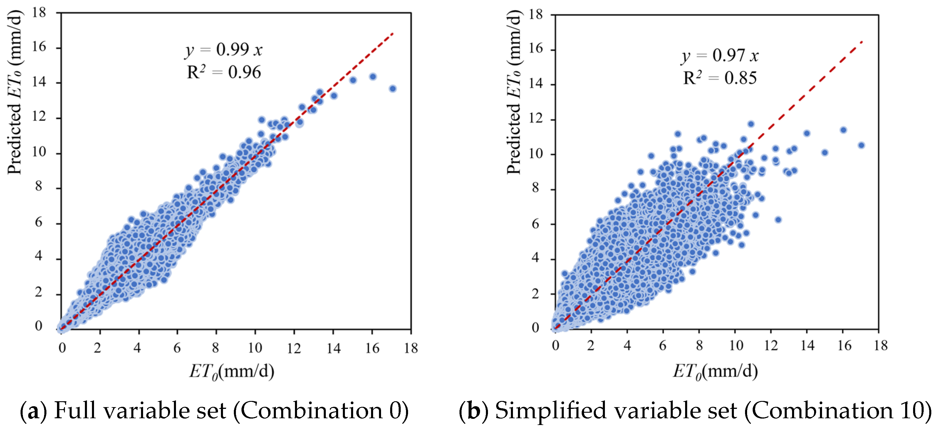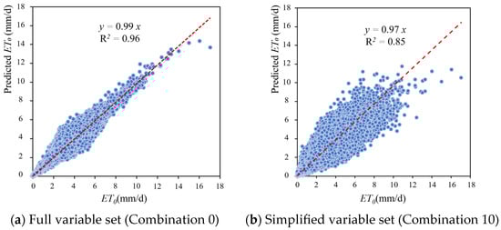 Comparison of predicted versus observed ET0 using (a) the full variable set (Combination 0) and (b) the simplified variable set (Combination 10).