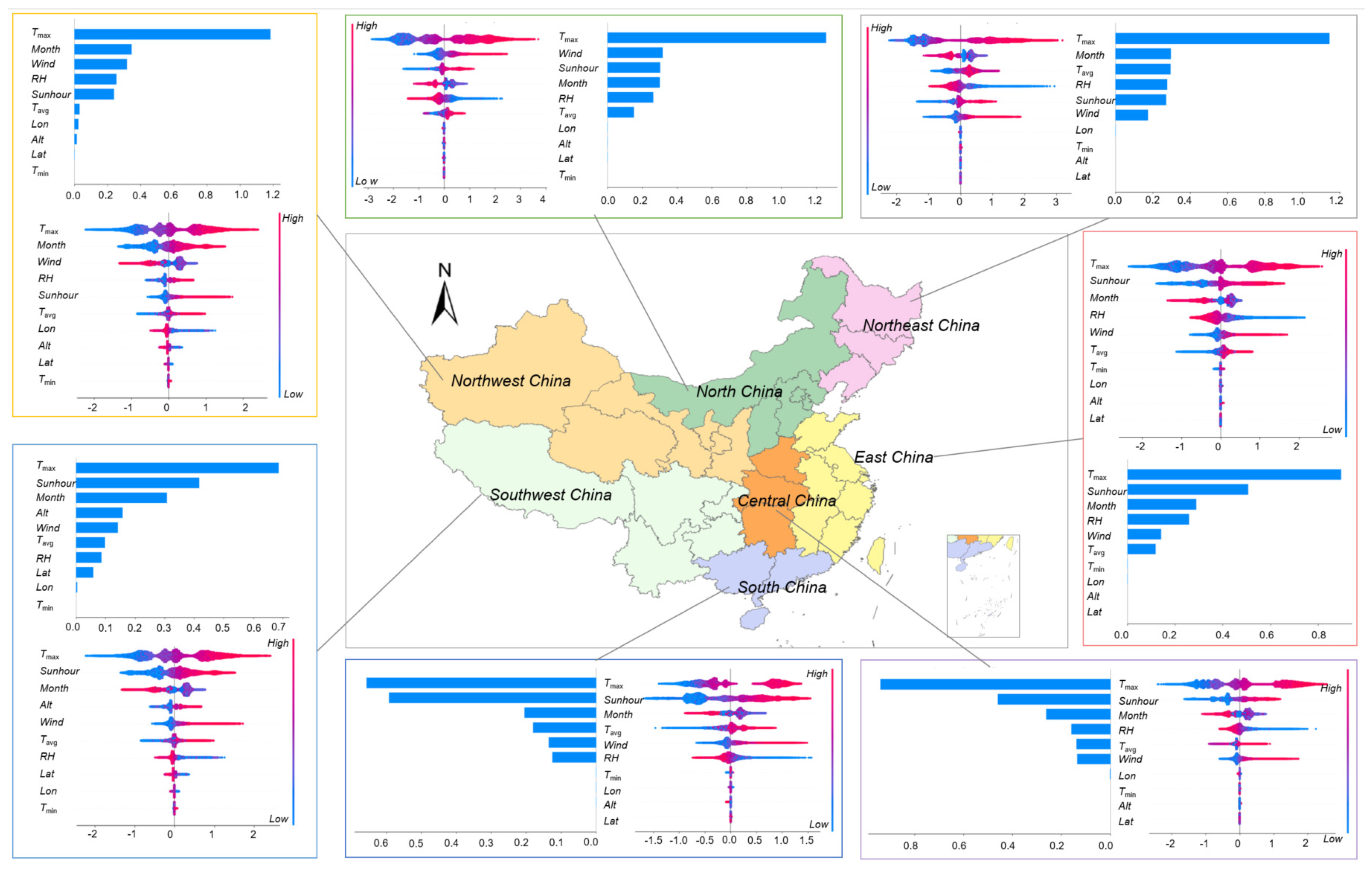 Northeast China—characterized by a cold-temperate and mid-temperate continental monsoon climate—exhibits the following feature importance ranking (Figure 3): Tmax > Month > Sunhour > RH > Wind > Tavg > Lon > Tmin > Lat > Alt. Consistent with the national model, Tmax remains the dominant factor, confirming its universal role as a key energy driver across climate zones. The prominence of Month (ranking second) reflects strong seasonal control, where high-latitude conditions create distinct seasons: prolonged cold winters with frozen ground versus short summers with intense evapotranspiration. The relative decline in Sunhour importance (third) may stem from comparatively lower variability in solar radiation during critical growing seasons. Longitudinal position surpasses latitudinal and altitudinal effects, capturing the climatic gradient from moist coastal areas to arid inland regions.
