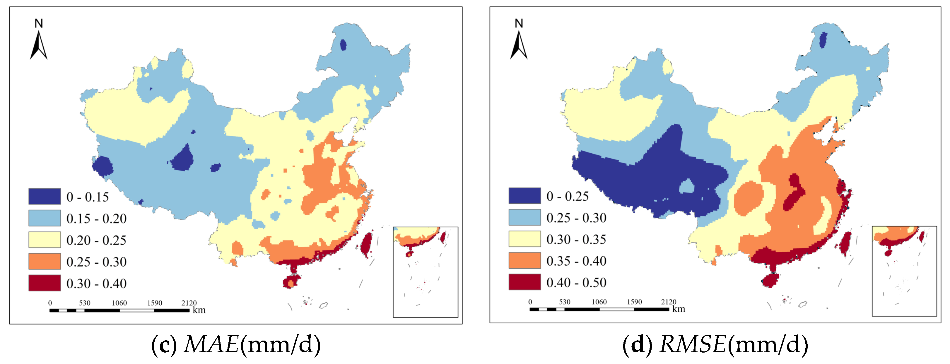 To evaluate the model’s generalization ability across different geographical regions, 20% of the samples from each meteorological station were randomly selected as a test set, and performance metrics were computed at the station level. It should be noted that this random selection approximates independence at the station level but does not fully ensure temporal or spatial independence. Therefore, the results provide an indicative assessment rather than a strict out-of-sample validation. Subsequently, to explore and visualize the nationwide spatial patterns of these station-level performance metrics, Ordinary Kriging interpolation was applied in ArcMap v10.8. This interpolation was used solely as an exploratory visualization tool and does not imply that the underlying performance metrics strictly satisfy spatial autocorrelation assumptions across all terrains [46].