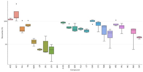 The matrix effect varied across pharmaceutical families, as shown in Figure 3. While no universally accepted threshold exists, values close to one are preferred, and effects within ±30% are often considered manageable without extensive signal correction. Analgesics and anti-inflammatory drugs exhibited a relatively stable response, with a mean matrix effect of 1.05 ± 0.12. Most values remained within the acceptable range, with a minimum of 0.88 and a maximum of 1.28, indicating that the extraction method is effective for this group and that matrix interferences are minimal. Antiepileptics showed a similar trend, with a mean of 0.95 ± 0.13 and values ranging from 0.72 to 1.05, suggesting a moderate but acceptable suppression effect in some cases.