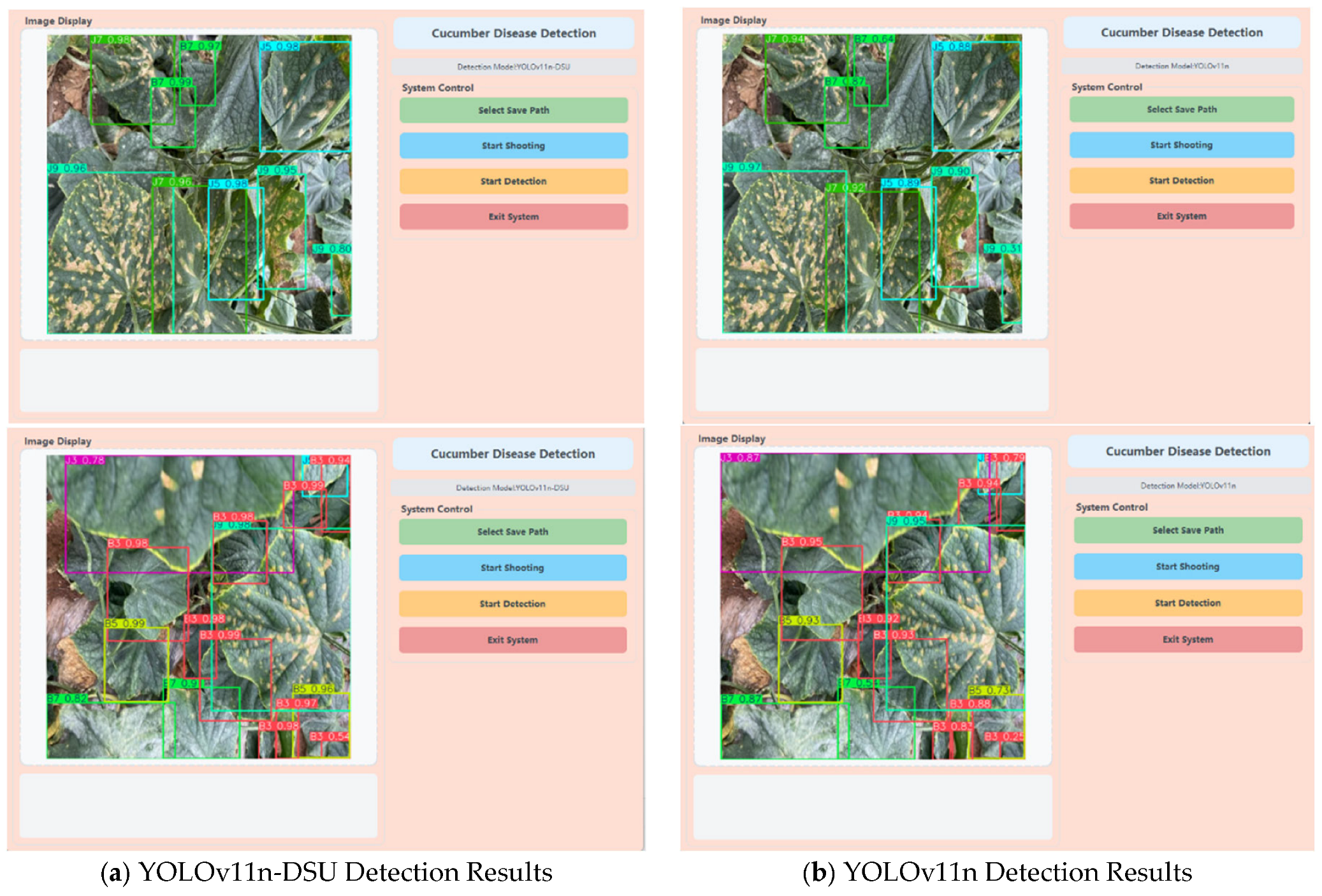 Chicago/Turabian StyleTang, Xiuying, Pei Wang, Zhongqing Sun, Zhenglin Liu, Yumei Tang, Jie Shi, Liying Ma, and Yonghua Zhang. 2026. "YOLOv11n-DSU: A Study on Grading and Detection of Multiple Cucumber Diseases in Complex Field Backgrounds" Agriculture 16, no. 2: 140. https://doi.org/10.3390/agriculture16020140