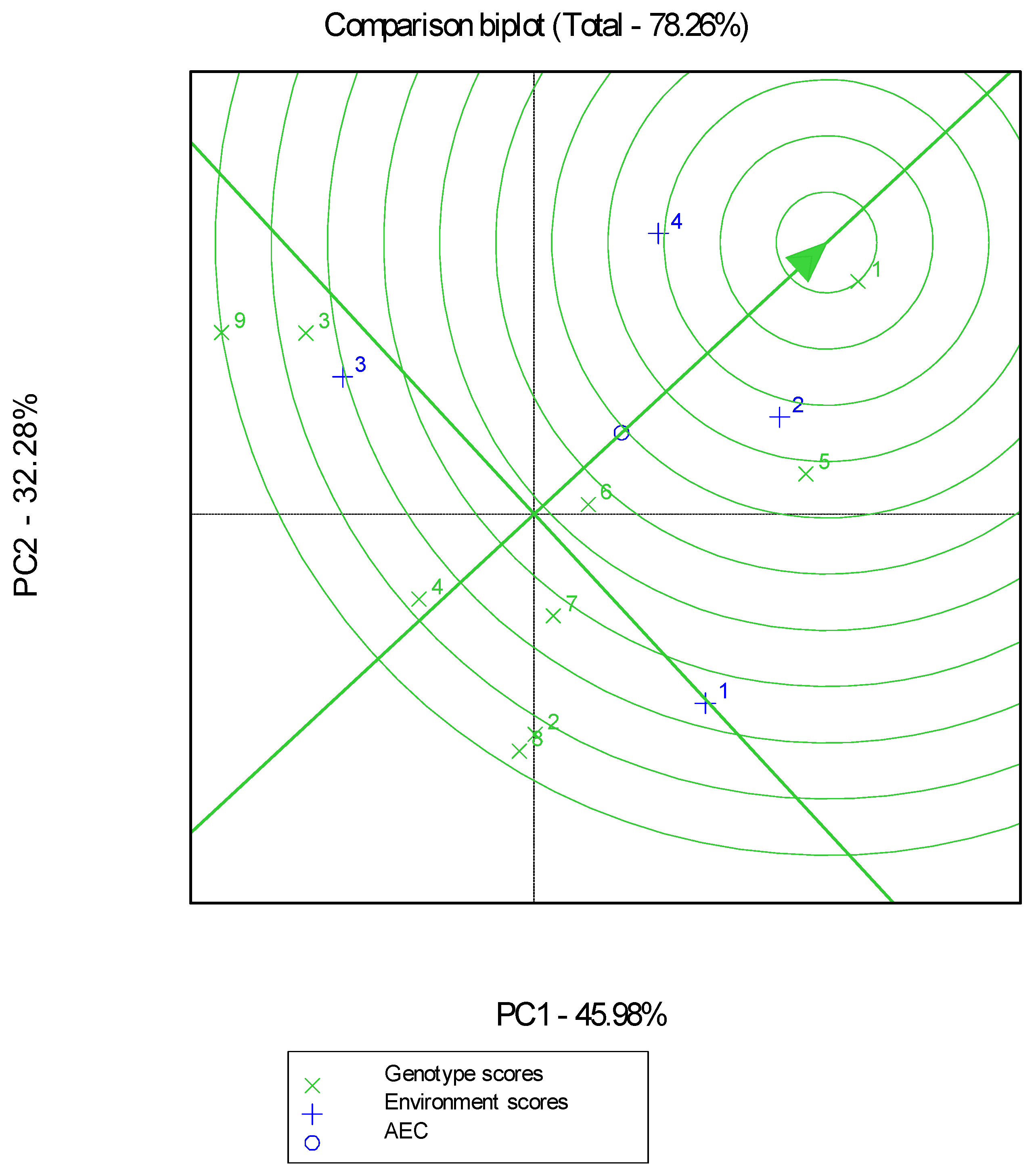 - Yan, W. Singular-Value Partitioning in Biplot Analysis of Multienvironment Trial Data. Agron. J. 2002, 94, 990–996. [Google Scholar] [CrossRef]
