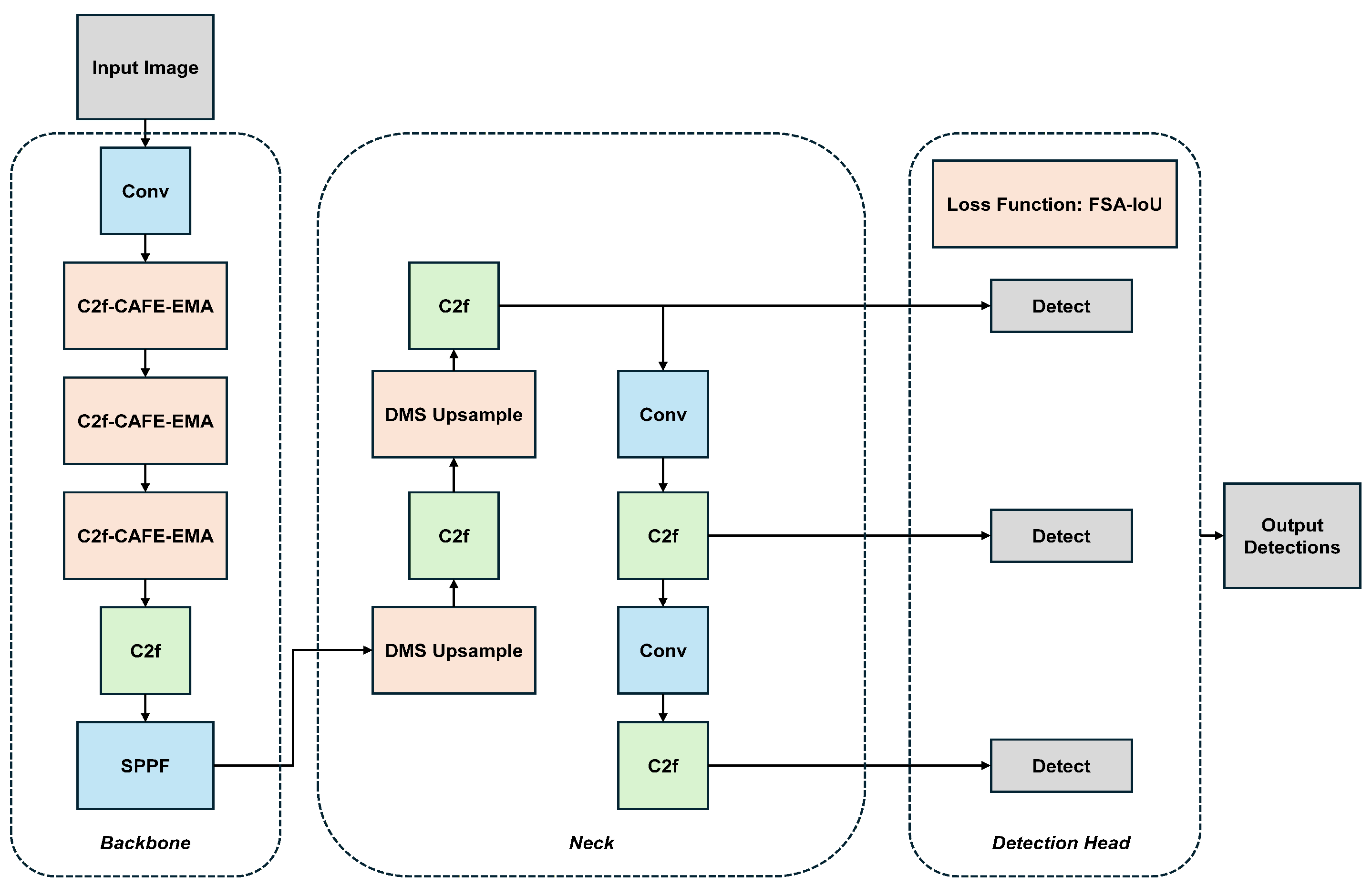 FSA-IoU: The FSA-IoU loss function (+F) shows modest standalone improvements, with mAP@0.5 increasing by 0.5 percentage points and mAP@0.95 by 1.2 percentage points, validating its effectiveness for precise bounding box regression. With proper hyperparameter adjustment (reducing from 0.3 to 0.15, extending warmup to 5 epochs), FSA-IoU avoids the recall degradation observed in the original configuration while maintaining its localization accuracy improvements. When integrated with CAFE and DMS, FSA-IoU provides complementary localization benefits (+0.5 percentage points mAP@0.5) without inference overhead.