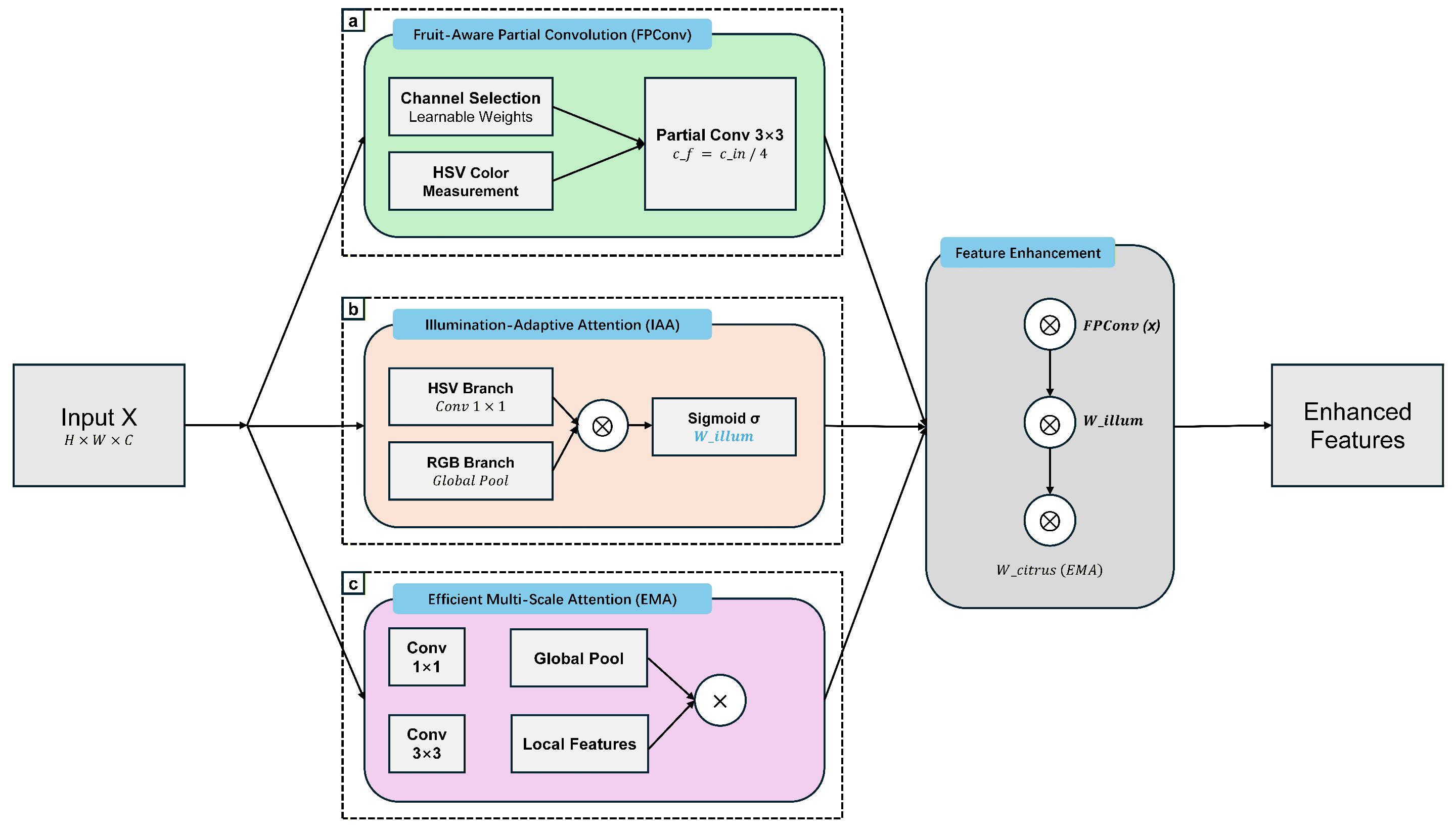 Illumination-Adaptive Attention (IAA): To handle varying illumination conditions in orchard environments, we introduce an illumination-adaptive attention mechanism: