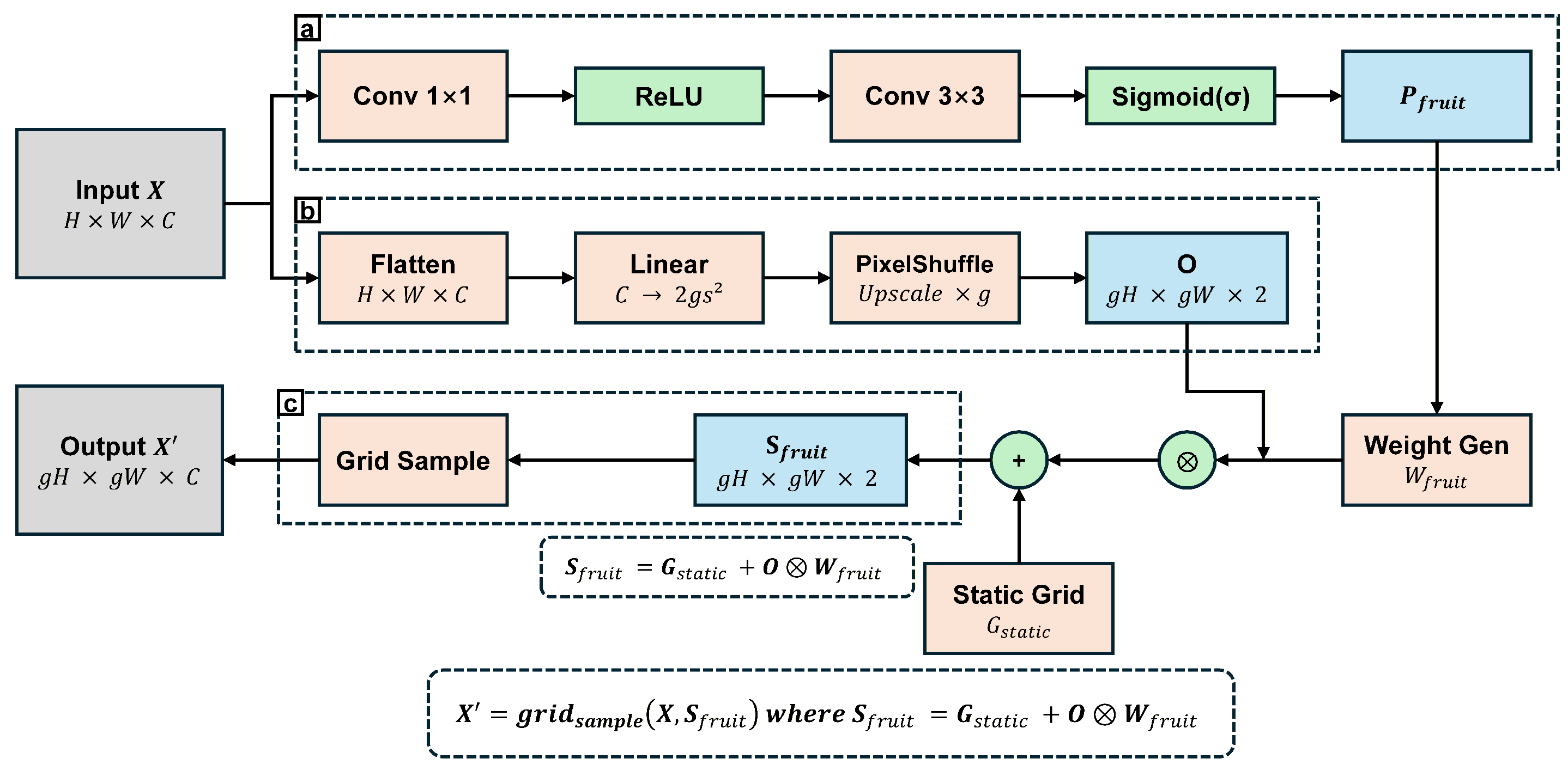 Here, denotes the regular grid, O represents learned offsets, and is the fruit-aware weighting derived from . This adaptive mechanism reduces background noise propagation by 42% (measured by signal-to-noise ratio in feature maps) compared to standard bilinear upsampling.