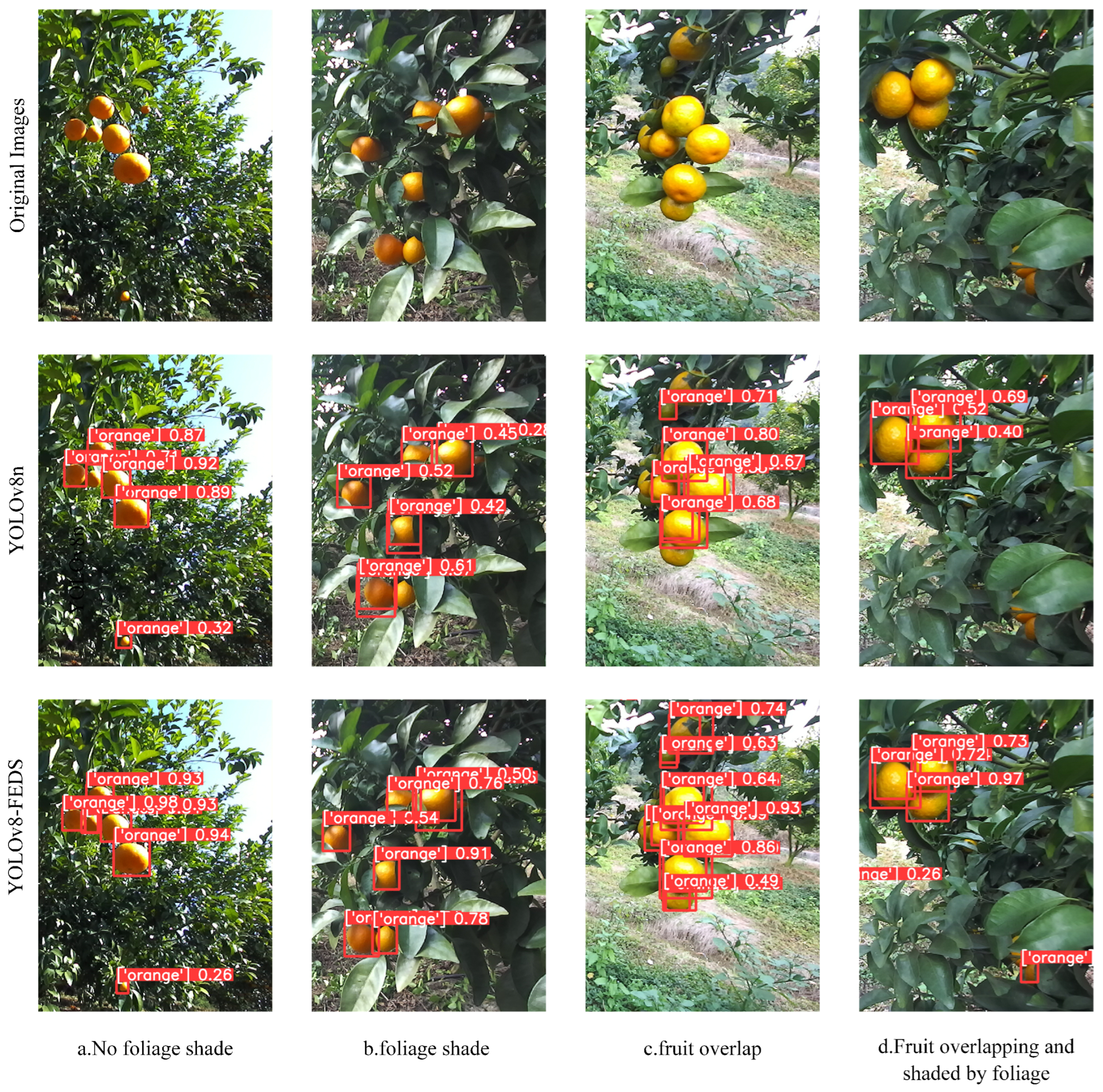 Figure 6 shows the detection results comparison between original YOLOv8n and our proposed ACDNet under various challenging scenarios representative of real-world orchard conditions.