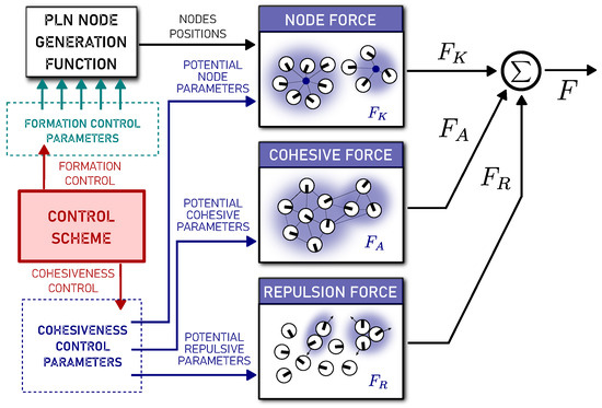 where is the sum of forces on each robot in the swarm. To follow a variable group formation pattern, the potential force is defined through the PLN system. On the other hand, is considered to be the group’s inter-attractive force that ensures the uniformity of the swarm. Finally, is defined as the repulsive force responsible for collision avoidance between group members and as a repulsive factor in general cohesiveness. As shown in Figure 2, the group’s cohesion is established through the summation of forces based on APFs. The resulting force F is composed of both the cohesive influence (as a result of the attractive–repulsive balance generated by and , respectively) and the formation-influenced force derived from the node structure. Furthermore, both the handling of the PLN structure and the group cohesiveness can be dynamically adjusted through a set of input variables. The ones that define the PLN structure (i.e., the target pattern and its corresponding collective motion) are considered as formation control parameters. Meanwhile, the variables that generate the potential influence are defined as cohesiveness control parameters. In this way, under an appropriate control scheme, the cohesive PLN system is capable of guiding the group’s formation pattern while maintaining swarm cohesion.