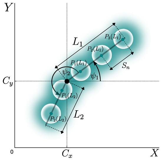 where represents the length of the first link; the total structure length is defined as ; is the distance between any two consecutive nodes, ensuring a uniform distance between them. Additionally, specifies the orientation of the first link relative to the swarm center. The total number of nodes assigned within is determined as . Then, for each node inside , the respective position is calculated based on . Moreover, the node’s location on the second link is calculated as follows: