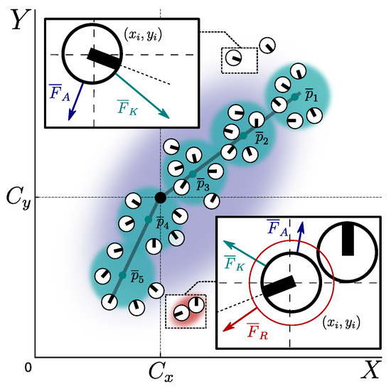 where represents the instantaneous swarm velocity vector derived from and . As long as and are the swarm linear and angular scalar velocities, is the unitary direction vector of the swarm. Finally, is denoted by the alignment degree of the entire group, which is given by the following: