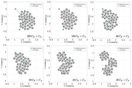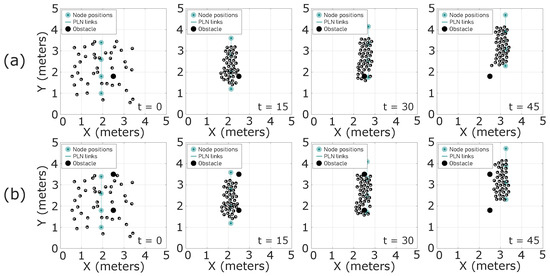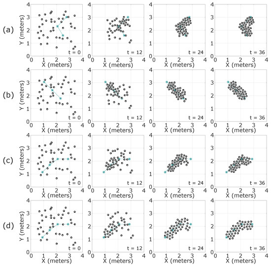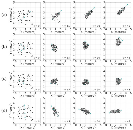 In order to evaluate the PLN-based formation system, the tests were conducted by adjusting the cohesiveness and formation parameters under aggregation constraints (i.e., the swarm is defined as stationary). For all attempts in Figure 7, the robot’s distance between wheels is defined as [m] and the wheel radius is defined as [m]. As long as the swarm does not present collective motion in these tests (i.e., aggregation behavior refers only to gathering), the swarm’s linear and angular velocities are defined as and , respectively. In contrast, these sets of trials were designed to assess the group’s formation pattern response under cohesive parameter tuning, as Figure 7 illustrates. All tests were performed with 40 mobile differential robots on a two-dimensional space of m. In trials (a), (b), and (c), cohesive parameters remained constant while the PLN structure was varied. The first three trials were cohesively adjusted based on responses from Section 5. Stable cohesion that does not significantly compromise the pattern formation was observed on the relation . Following this correlation, parameter values were defined as and . In contrast, the trial (d) was performed under different cohesive values (, , ). In addition, (a), (b), and (c) were adjusted with different formation parameters in order to evaluate the swarm’s aggregation behavior under differentiated gathering points. The remaining parameter for this Section can be found in Table 2.