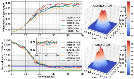 The evaluation of a swarm’s cohesiveness involves applying an appropriate measurement method which considers the position of all members. For example, although Figure 5 shows evident modifications in response to changes in both the node’s attractive coefficient and cohesion-attractive coefficient , these variations must be quantified. In this context, the density of the swarm (i.e., the number of robots in a given area) turns into an important concept to evaluate the group’s unity. To achieve this, non-parametric techniques have been chosen for density estimation. From [74], we assume a positional vector that contains the coordinates of n mobile robots. Consequently, the estimated probability of robots in to fall in a region is given by the following: