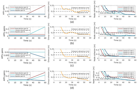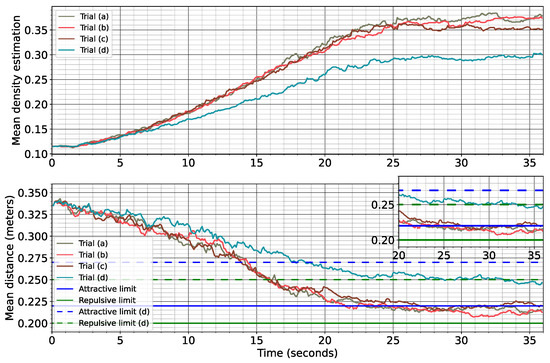 As mentioned above, trials (a)–(d) were performed with constant cohesive parameters previously analyzed in Section 5. These tests demonstrate respective attraction distance tracking and repulsive boundary avoidance. Conversely, trial (d) was simulated with a higher node’s attractive coefficient . Although a more node-condensed behavior was expected (such as the relation from Figure 5), this trial was set up with a different repulsive minimum distance [m] and an attractive equilibrium distance [m]. The result obtained refers to a lower dense formation with a more covered space. The mean density estimation of this trial is lower with respect to others, while attractive distance tracking is not achieved. Moreover, the robots tend to come close to the repulsive limits. This behavior implies the need for cohesive parameter re-adjustments when potential collective distances are modified. However, it also means that the swarm would be cohesively flexible with an appropriate parameter setting. Consequently, these initial experiments demonstrate successful pattern formation under conditions without collective CM.