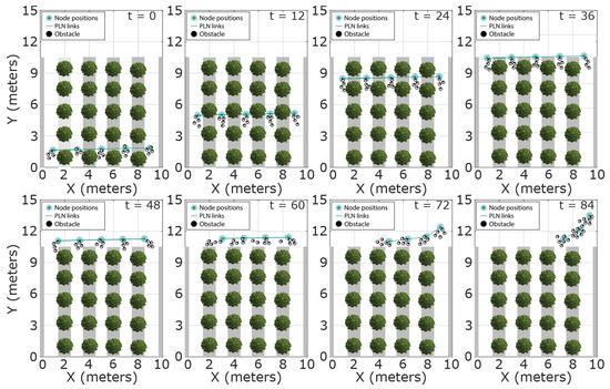Robotic swarms offer a promising paradigm for addressing the challenges of modern agriculture by exploiting collective behavior and decentralized control [32,33,34]. Their inherent scalability and robustness enable efficient coverage and real-time responsiveness across large, heterogeneous cropping environments, which are often difficult to monitor and manage using traditional machinery or single-robot systems [35,36]. Swarm robotics provides notable advantages in precision agriculture tasks, including crop monitoring, pest detection, targeted spraying, soil analysis, and automated harvesting [12,37]. Furthermore, weed management and selective herbicide application by intelligent swarm robots contribute to ecological balance and reduce herbicide resistance risks. Leveraging distributed sensing and cooperative decision-making, swarms can dynamically adapt to changing field conditions, minimize redundant overlaps, and optimize the utilization of resources such as water, fertilizers, and pesticides [10,12]. Additionally, robotic swarms assist in pollination and livestock health monitoring, addressing declines in natural pollinators and improving animal welfare [38]. Moreover, the flexibility of swarm formations facilitates navigation around irregular crop patterns, obstacles, and variable terrain, thereby enhancing operational safety and efficiency [39,40]. Recent developments in control frameworks provide robust mechanisms for maintaining regular patterns and coordinated motion despite external disturbances common in agricultural settings [41], such as those illustrated in Figure 1. Both simulated and real-world experiments increasingly validate the effectiveness of swarm-based approaches in achieving precise spatial and temporal control while preserving robustness under system uncertainties [42,43]. The ongoing integration of swarm intelligence with agronomic knowledge and advanced sensing technologies has the potential to accelerate the digital transformation of agriculture, supporting high-throughput, resilient, and environmentally sustainable crop production systems [38].