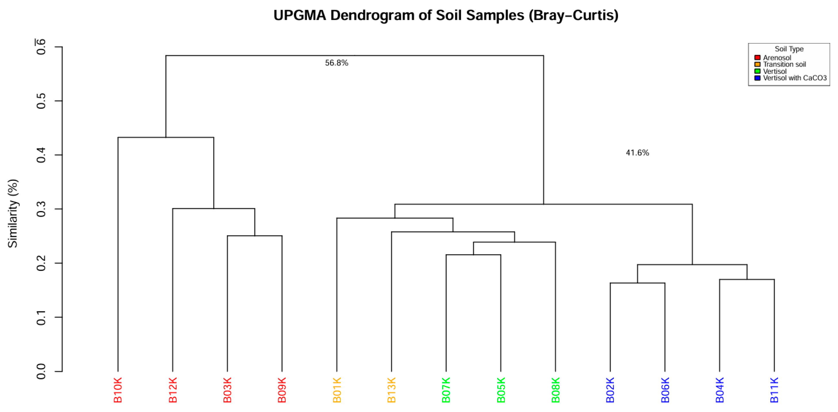 3.3.1. Cluster Analysis of Soil Microbial Communities Based on UPGMA Dendrogram