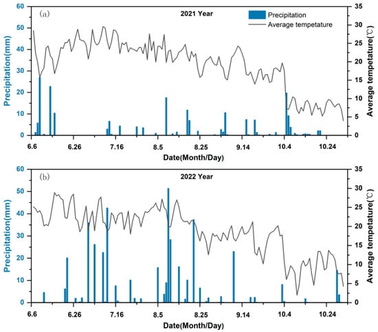 Average temperature and precipitation during the two experimental years in 2021 (a) and 2022 (b).