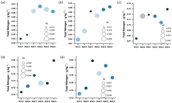 Distribution of total soil nitrogen across different carbon-nitrogen gradients during the seedling stage (a), jointing stage (b), booting stage (c), heading stage (d), and maturity stage (e), respectively. The size of the circle is related to the standard error (SE).