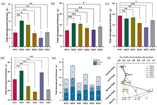 Accumulation of aboveground biomass during the seedling stage (a), jointing stage (b), booting stage (c), and heading stage (d), under different biochar-to-nitrogen gradients; biomass accumulation of stem, leaf, and spike organs at maturity stage (e) (Note: The units of figures (a–e) are g plants−1); dry matter accumulation rate (f) (Note: The unit of figure (f) is g plant−1 day−1). *, **, and *** indicate significance at p < 0.1, p < 0.05, and p < 0.01, respectively; different lowercase letters indicate significant differences (p < 0.05) between biochar and nitrogen gradients; n.s., no significant difference.