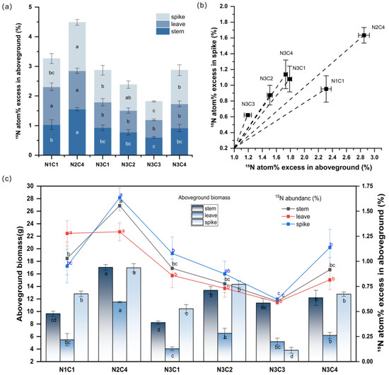 Distribution of 15N abundance in stem, leaf, and spike under different biochar and nitrogen application gradients (a), the ratio of 15N abundance between aboveground plant parts and spike (b), and the relationship between 15N abundance in stems, leaves, and spike and dry weight (c). The data values used in the image are listed in (Table 1) below. The data here are means ± standard errors (n = 3). Different lowercase letters indicate significant differences between treatments as determined by one-way ANOVA followed by Duncan’s multiple range test (DMRT) at p < 0.05.