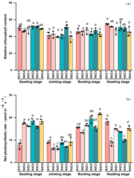 SPAD exhibited different trends across varying biochar-to-nitrogen gradients (Figure 7a). The control group, N2C4, N3C2, N3C3, and N3C4, showed an initial decrease followed by a gradual increase throughout the growth cycle. Unlike the other treatments, N3C1 exhibited an initial decline followed by a more pronounced increase. Initial SPAD values were similar at the seedling stage, as treatment effects had not yet fully manifested. Compared to the seedling stage, the significant decrease in SPAD across all treatments during the jointing stage may have been due to rapid growth; nitrogen was preferentially allocated for stem elongation, potentially leading to a “dilution” of SPAD. At the jointing stage, except for N3C3, SPAD in all other treatments decreased significantly, coinciding with a shift in the plant’s growth focus. Nitrogen and photosynthetic products were preferentially utilized for stem elongation, likely influencing SPAD levels.