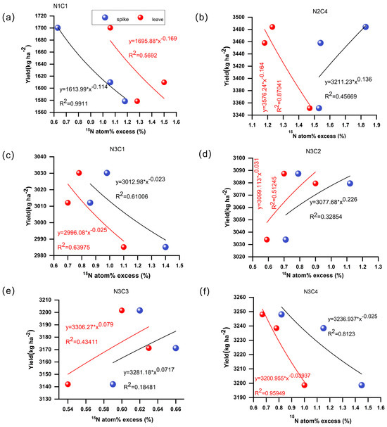 Correlation between 15N abundance in mature spike and yield. Figures (a–f) represent different treatments, respectively. N1C1 (a), N2C4 (b), N3C1 (c), N3C2 (d), N3C3 (e), N3C4 (f).