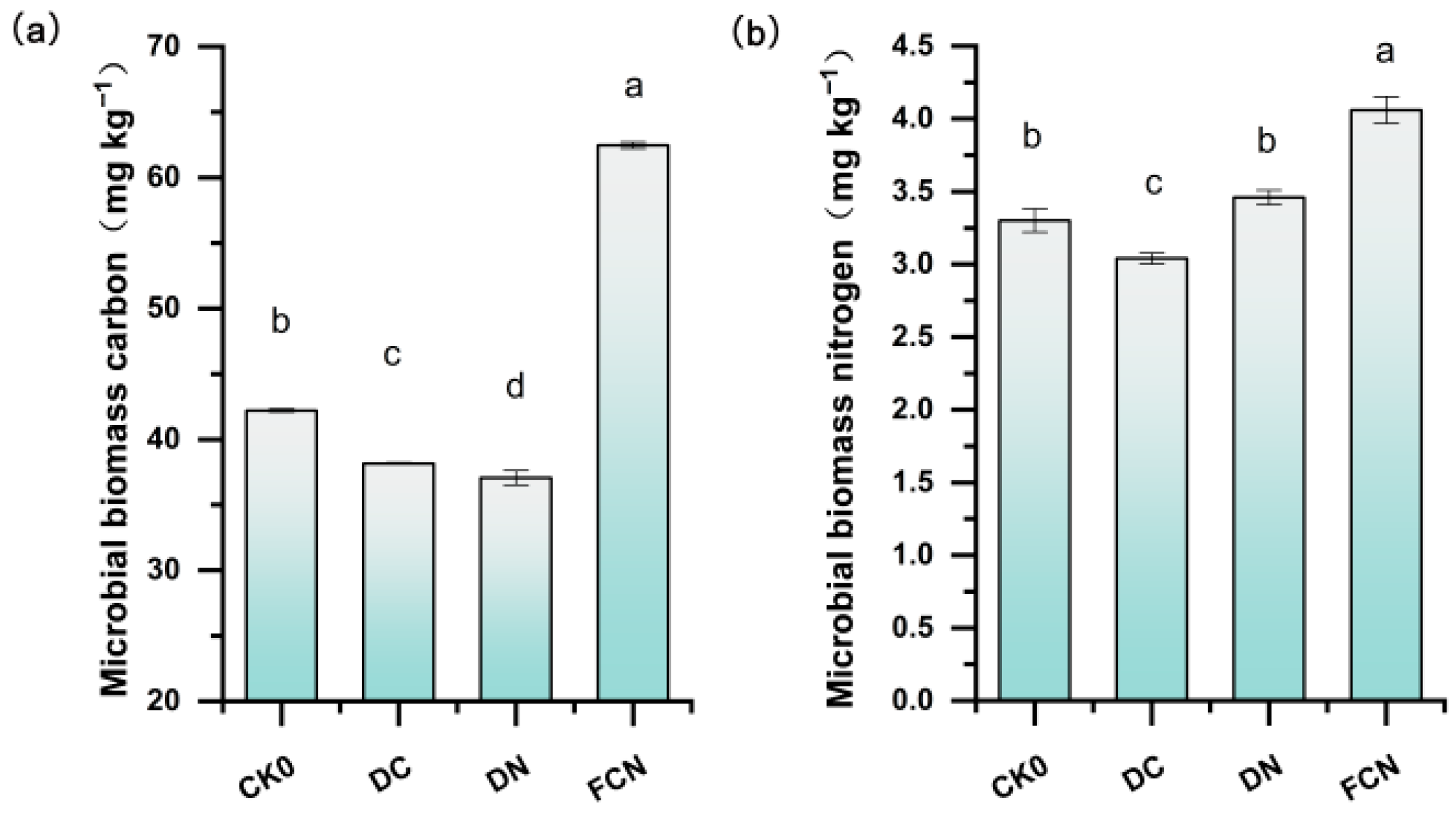 3.1.1. Preliminary Experiment: Influence of Microbial Carbon and Microbial Nitrogen Contents in Soil