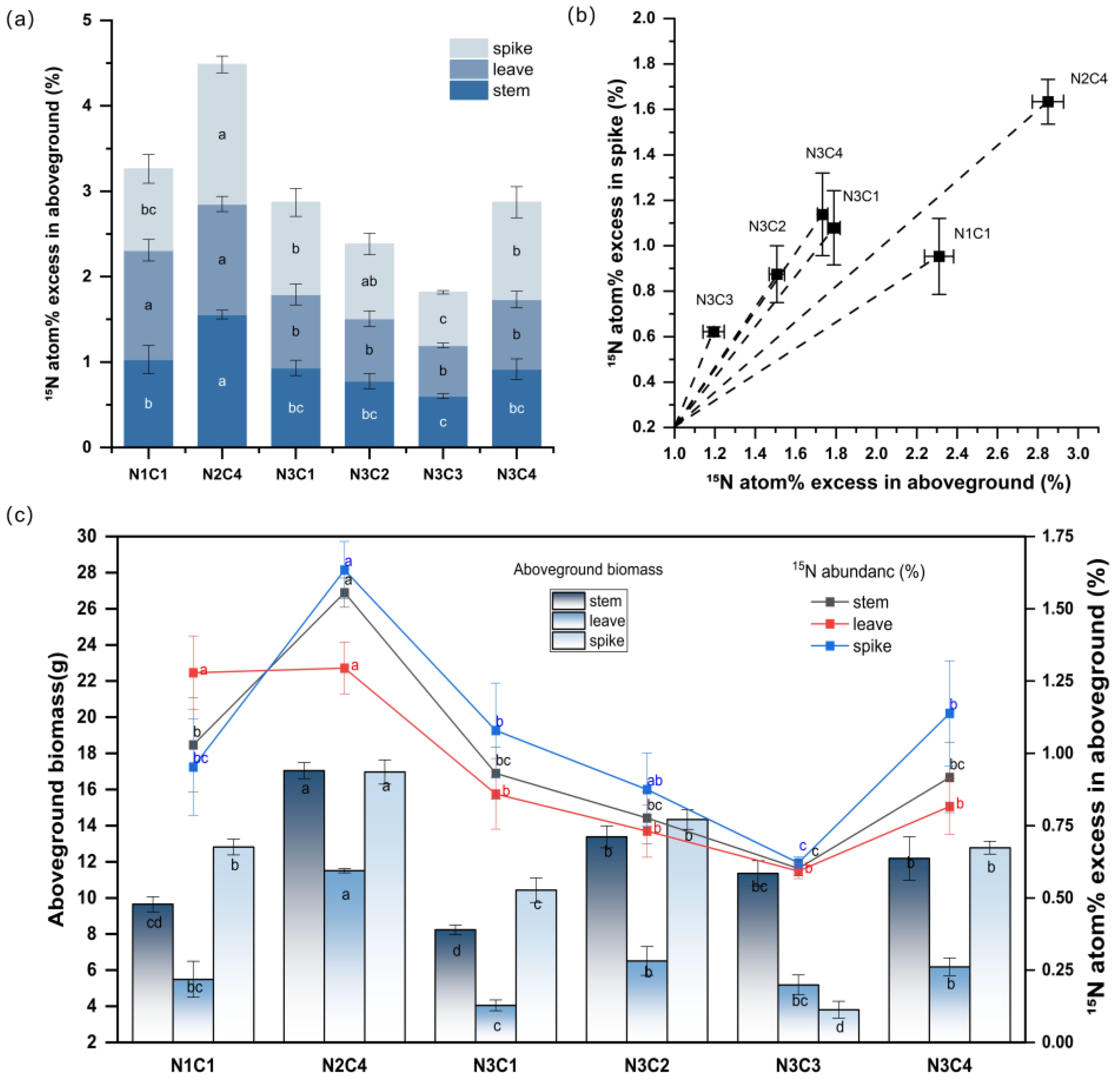 | Treatment | Stem (15N Atom% Excess) | Leaf (15N Atom% Excess) | Spike (15N Atom% Excess) |