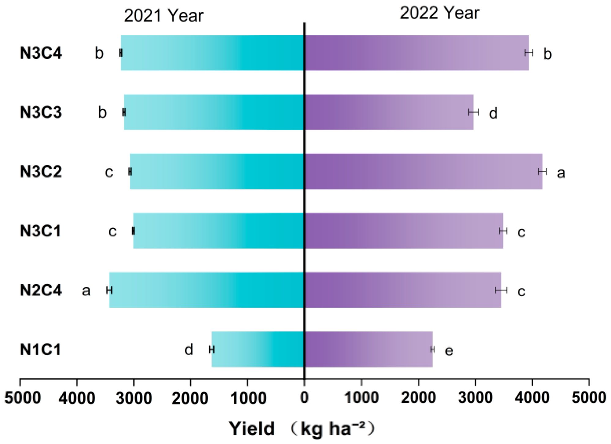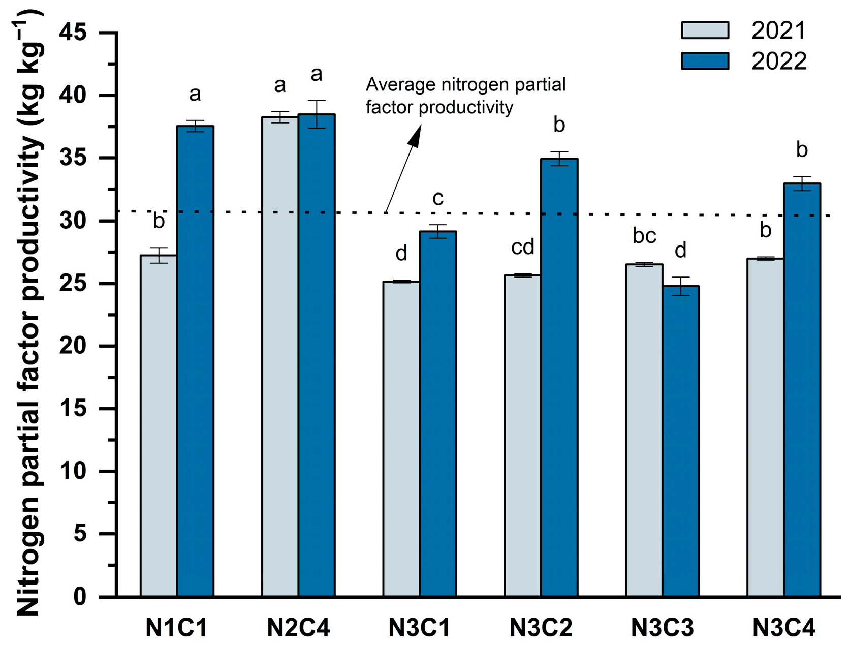 3.6. Comparison of Nitrogen Partial Factor Productivity
