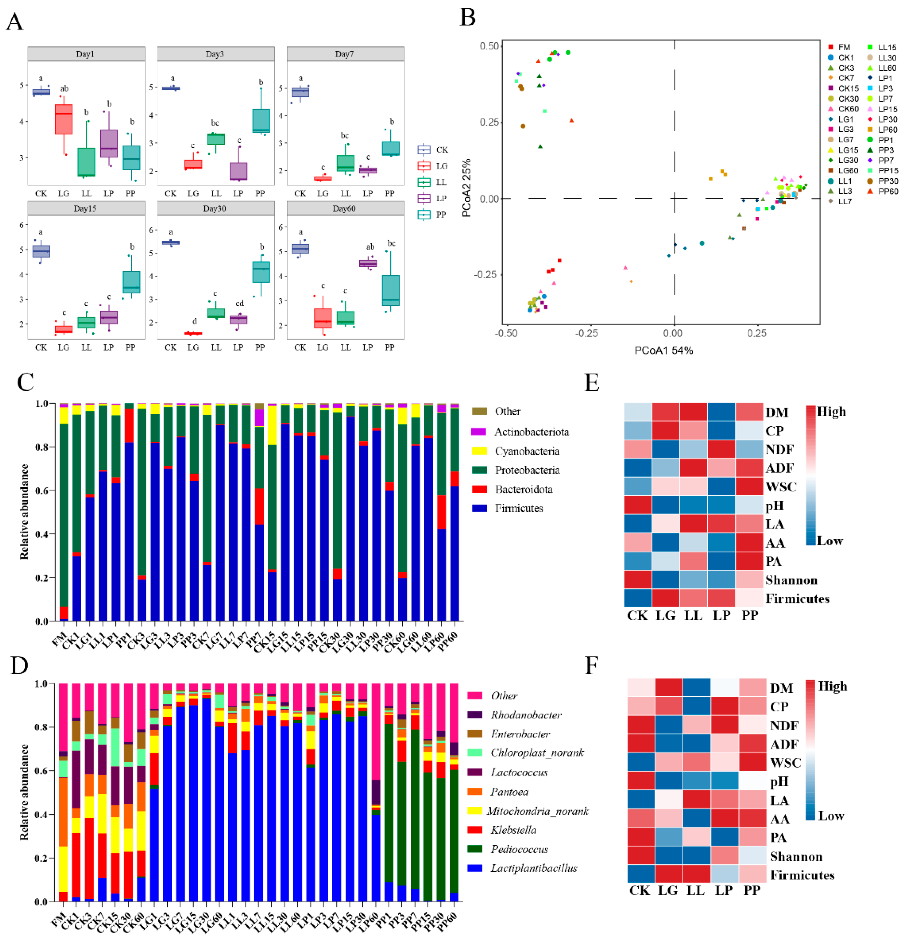 - Keshri, J.; Chen, Y.; Pinto, R.; Kroupitski, Y.; Weinberg, Z.G.; Sela Saldinger, S. Microbiome dynamics during ensiling of corn with and without Lactobacillus plantarum inoculant. Appl. Microbiol. Biotechnol. 2018, 102, 4025–4037. [Google Scholar] [CrossRef]