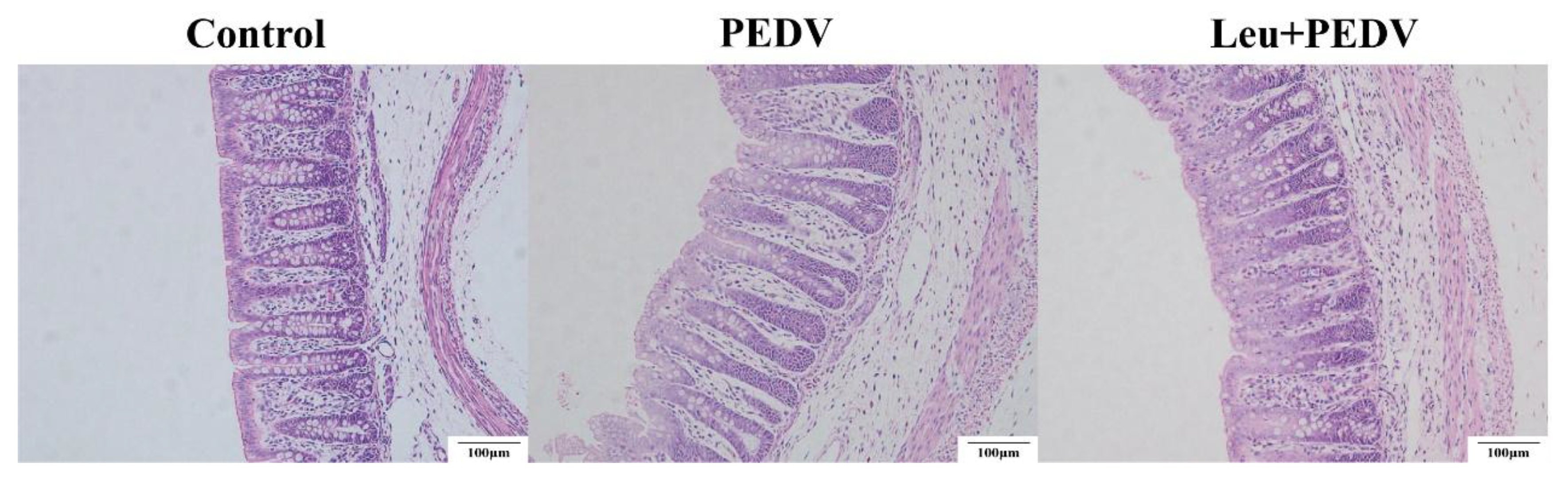 23]. Consistent with this finding, our study demonstrated that Leu administration significantly reduced colonic CD in PEDV-infected piglets, suggesting Leu’s mitigating effect on PEDV-induced intestinal mucosal damage in piglets.