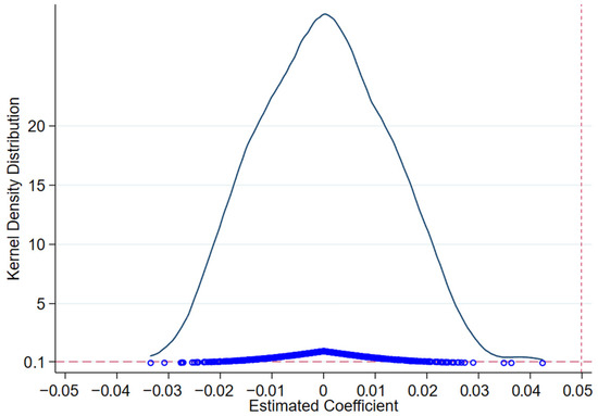 To rule out the interference of other random factors, in this paper, the pilot sites of the Demonstration Project for E-commerce in Rural Areas are randomly set in arbitrary counties or districts. In this way, a randomly generated set of pseudo-treatment groups is obtained, and the remaining farmer household samples serve as the control group for conducting a placebo test. After 500 random and repeated samplings, as shown in Figure 1, the curve represents the kernel density distribution of the estimated coefficients; these coefficients are all concentrated around 0 and follow a normal distribution. The hollow dots represent the p-values corresponding to the estimated coefficients, and most of them are greater than 0.1. The vertical dashed line indicates the true estimated value of 0.0499, which appears as a prominent outlier in the figure; this shows that the above research results are indeed influenced by the demonstration policy, rather than being obtained accidentally.