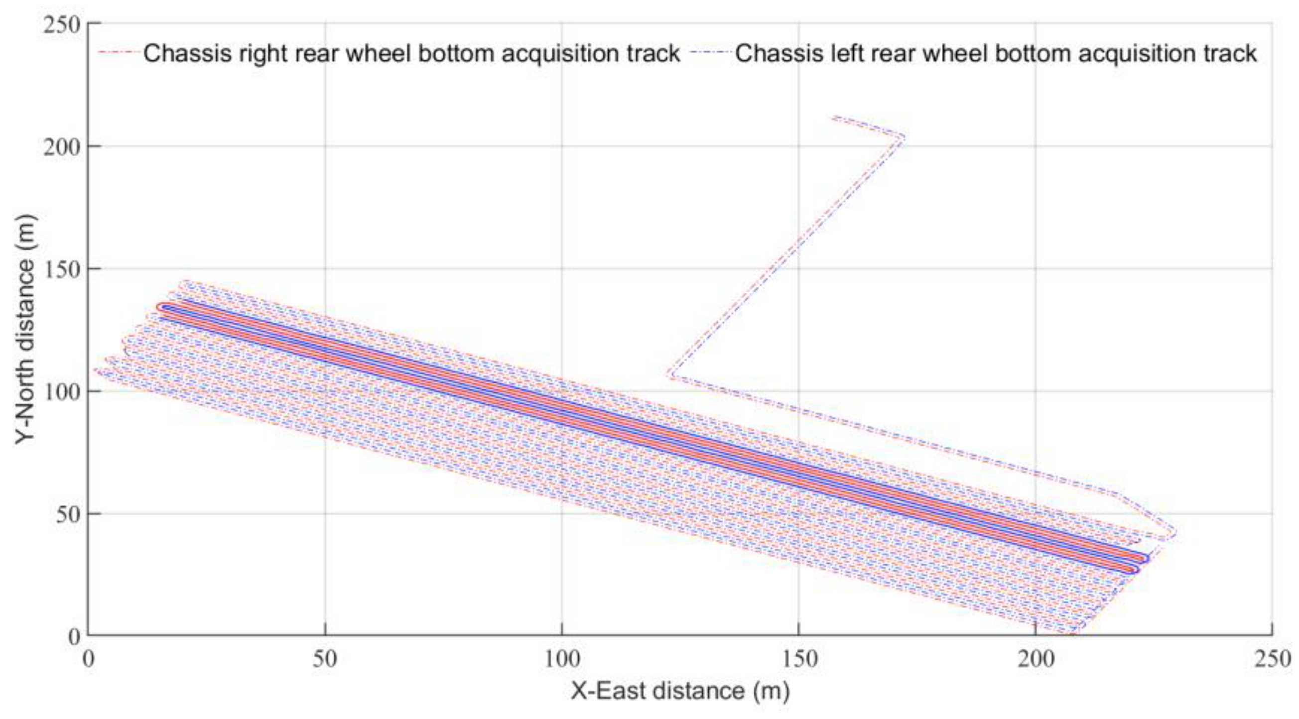 8]. In practical field operations, agricultural machinery primarily follows planned straight sections. The quality of straight-line segment operations critically impacts overall field performance. To extract representative hard bottom layer trajectory patterns, straight-line segments were isolated from the full-field hard bottom layer contour. The full-field wheel bottom trajectory is illustrated in