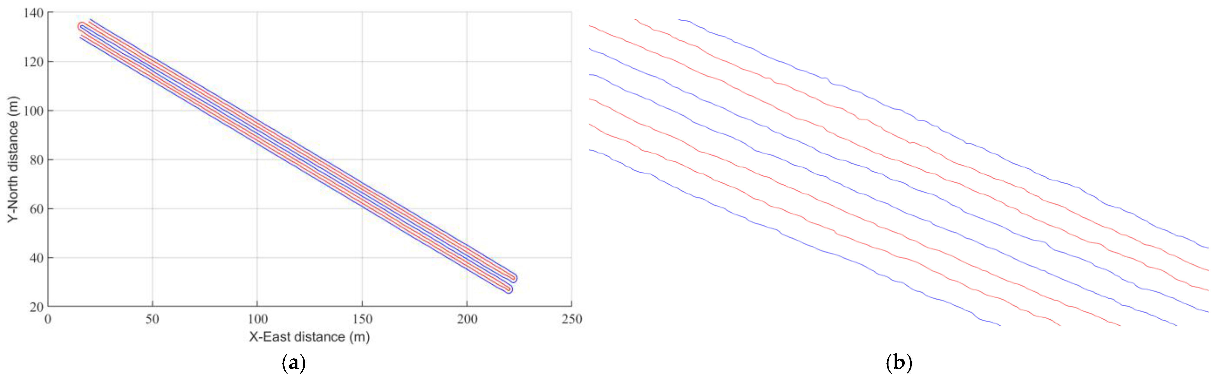 23] developed front and rear wheel yaw angle observers based on extended kinematic equations for front-wheel steering and four-wheel steering agricultural vehicles, utilizing dual-antenna GNSS and INS. They applied the estimated values to path-tracking control, effectively enhancing tracking accuracy. Regarding operational effectiveness, Zhou et al. [