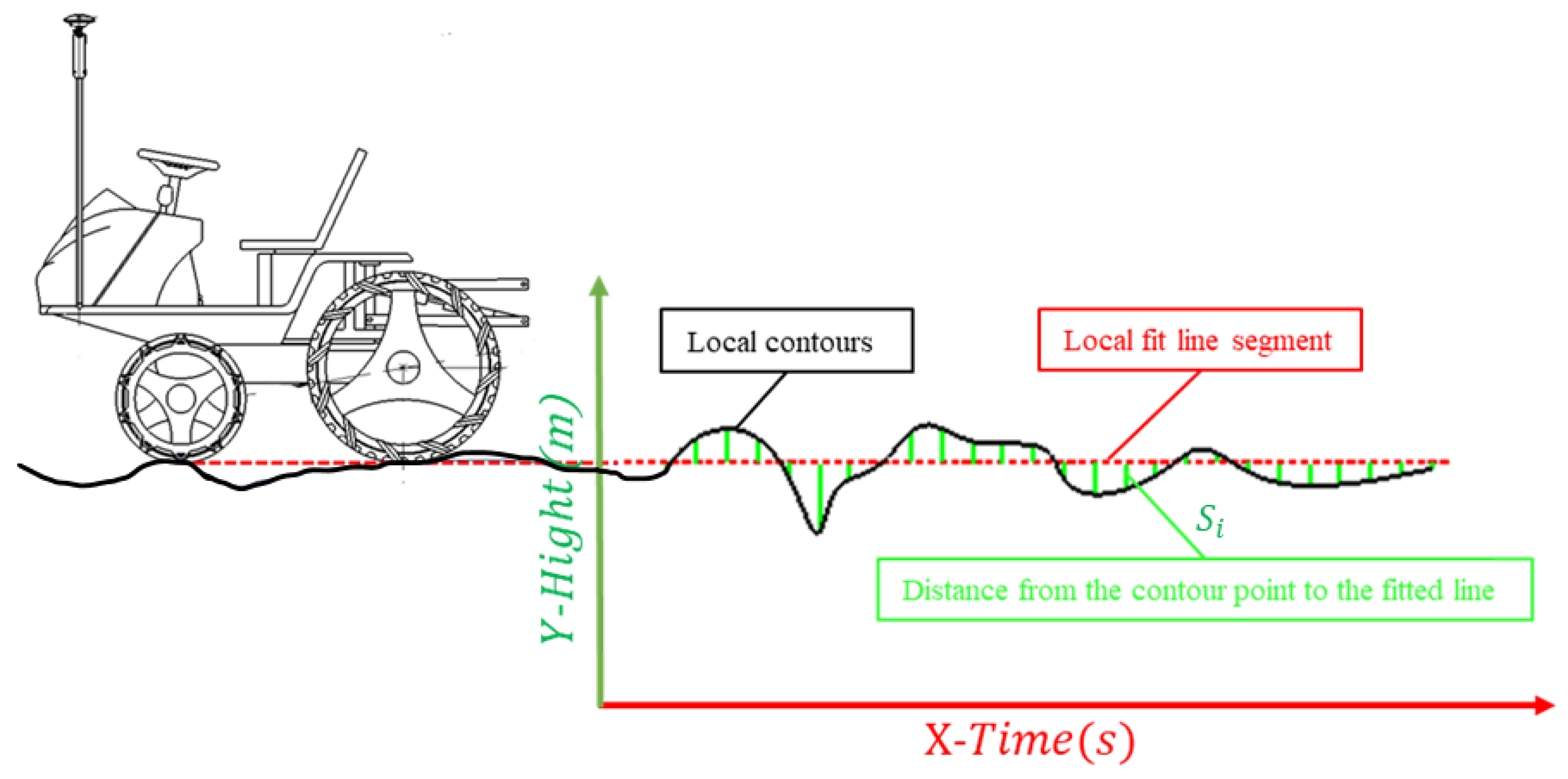 To further analyze the impact of localized characteristics of the hard bottom layer on the movement state of agricultural machinery, the surface roughness of the hard bottom layer is introduced to represent the degree of localized undulation. Based on the contour information of the hard bottom layer, a section spanning the agricultural machinery’s wheel base length was selected locally. A straight line was fitted using the least squares method, and the height of each point relative to this fitted line was calculated. The relationship between the hard bottom layer contour, the locally fitted line segments, and the height of contour points relative to the fitted line is illustrated in