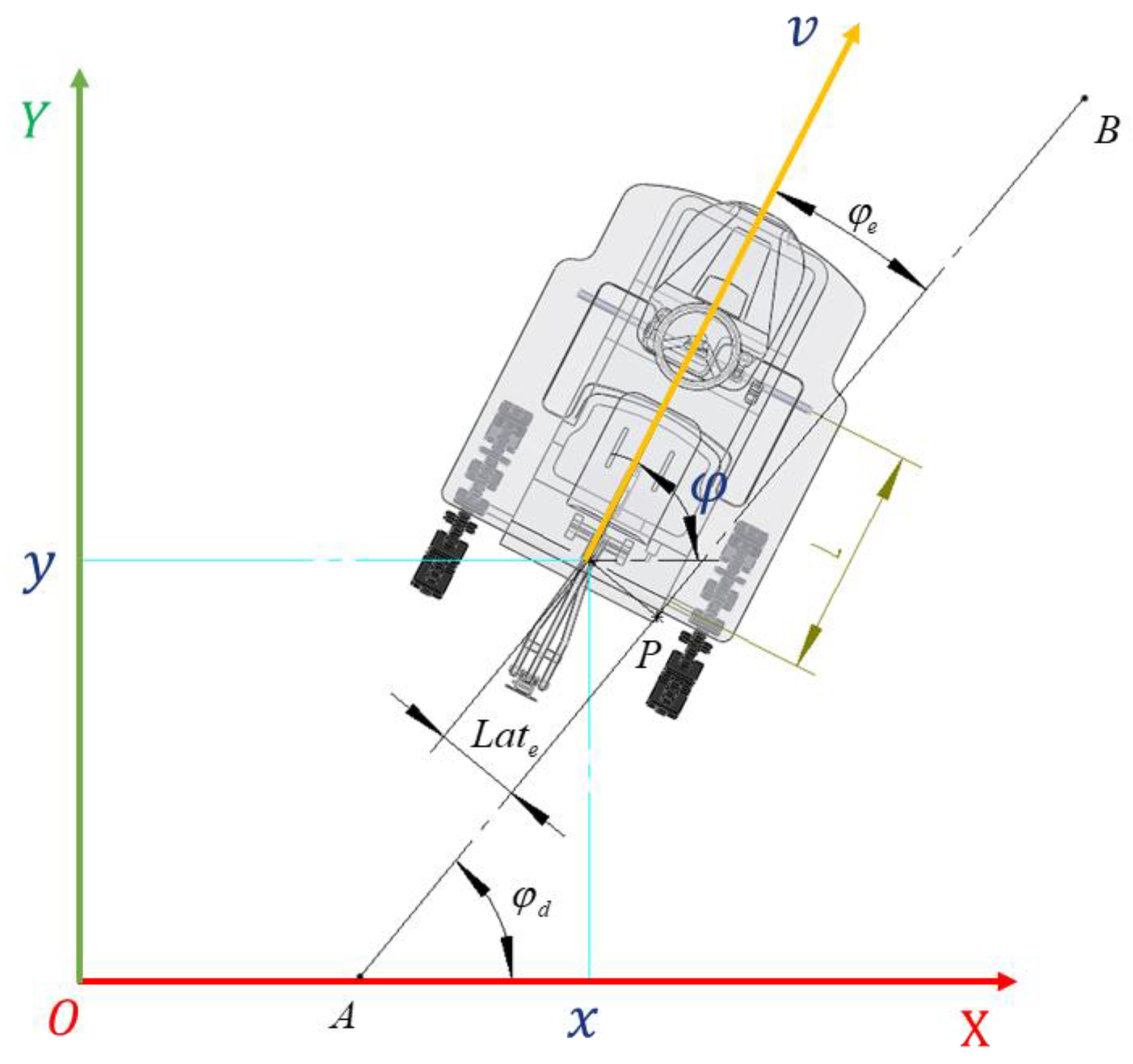 Schematic diagram of lateral deviation and heading deviation in agricultural machinery. Note: In the figure, represents the target heading angle, denotes the heading angle deviation, and indicates the lateral position deviation. The target navigation line is formed by points and , with serving as the target navigation point.