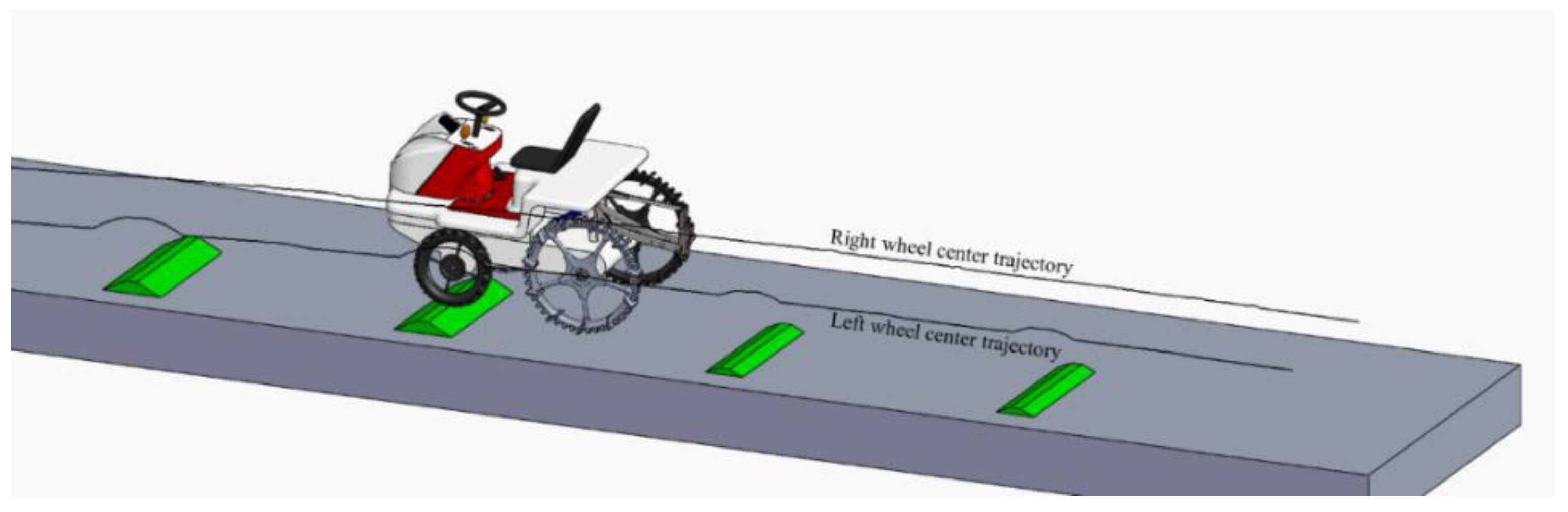7] remains poorly understood in terms of its impact on the position and attitude changes in agricultural machinery. This lack of clarity constrains the optimization of operation control strategies and hinders the advancement of intelligent operation levels, so it is imperative to elucidate the influence patterns of typical hard bottom layer contours on the position and attitude changes in agricultural machinery. Early terrain mechanics theories provided the foundation for modeling wheel–ground interactions. Bekker and Wong systematically established mathematical models for soft soil bearing capacity, settlement, and rolling resistance, offering theoretical support for vehicle dynamics response research [