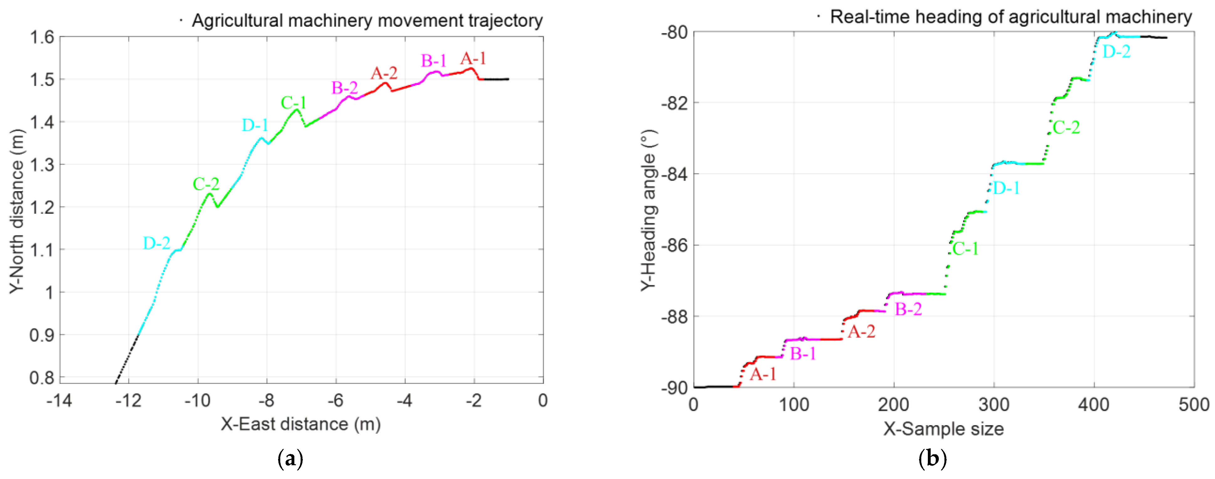 Trajectory curve and heading change rate of agricultural machinery: (a) trajectory of agricultural machinery traversing ridge platforms; (b) heading changes during agricultural machinery traversal of ridge platforms.