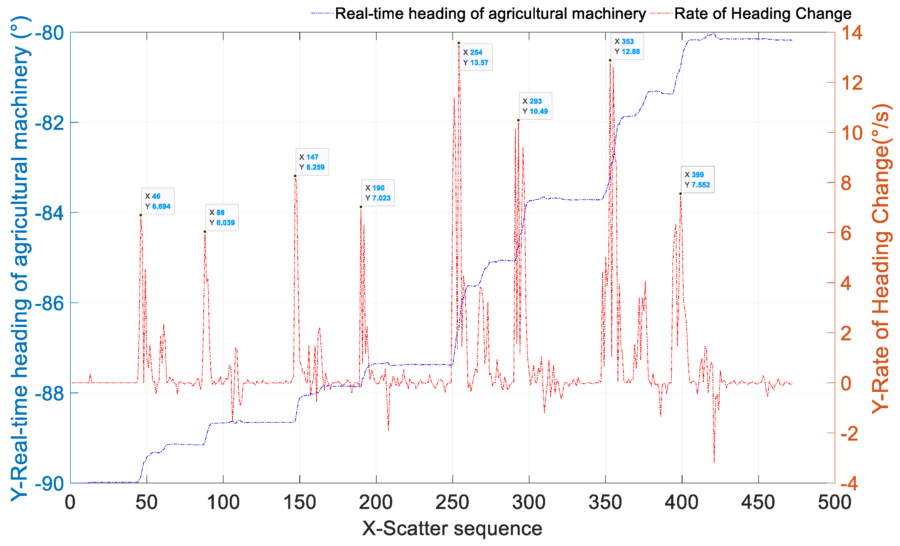 By applying differential operations to the positional time series data from the bottom of the left and right wheels and the center of the agricultural machinery’s rear axle, the corresponding kinematic parameters of the machinery can be derived. Specifically, performing first-order differentiation on the displacement time series of the left and right wheel bottoms yields the linear velocity of the right wheel bottom, the linear velocity of the left wheel bottom, and the velocity of the agricultural machinery’s rear axle center, respectively.
