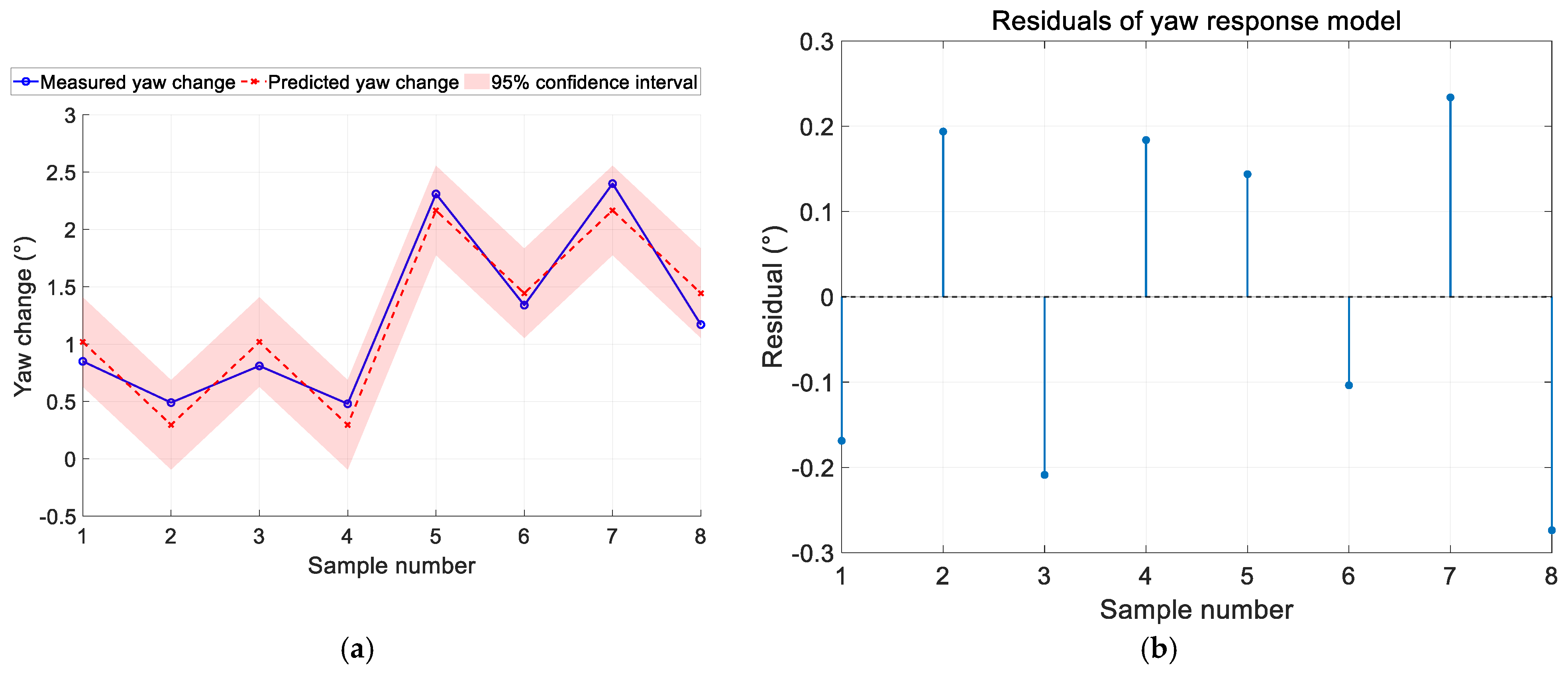 Comparison between measured and model-predicted heading change values: (a) numerical comparison; (b) residual plot.