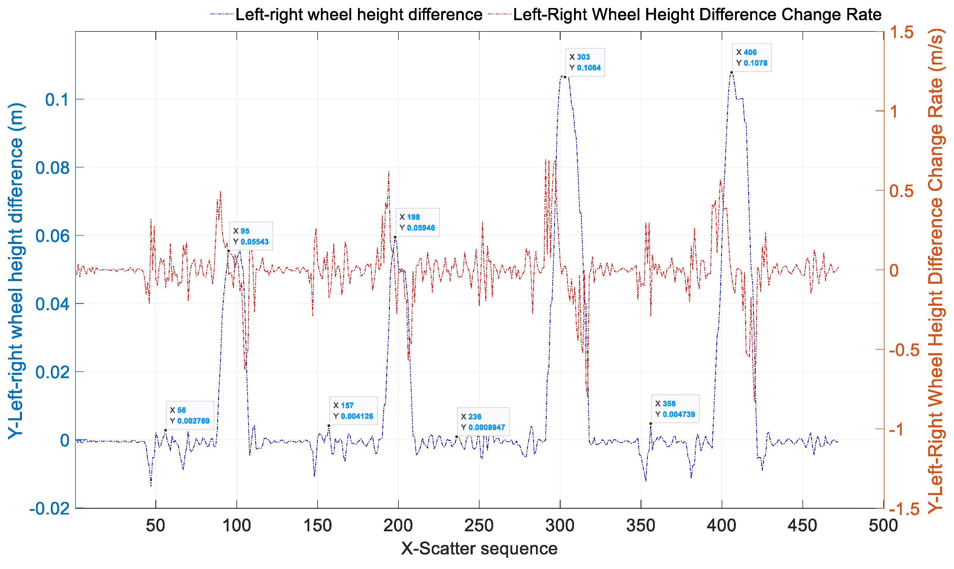 Based on the coordinate points connecting the 3D spline curve of the hard bottom layer contour, isolate the contour points of the hard bottom layer in contact with the bottom of left wheel. In the local tangent plane coordinate system, the X-axis coordinate value is , the Y-axis coordinate value is , and the Z-axis coordinate value is . Additionally, the X-axis coordinate value , the Y-axis coordinate value , and the Z-axis coordinate value of the hard bottom layer contour points contact the bottom of right wheel in the local tangent plane coordinate system, while the Z-axis coordinate height difference between the hard bottom layer contours contacts the bottom of the left and right wheels.